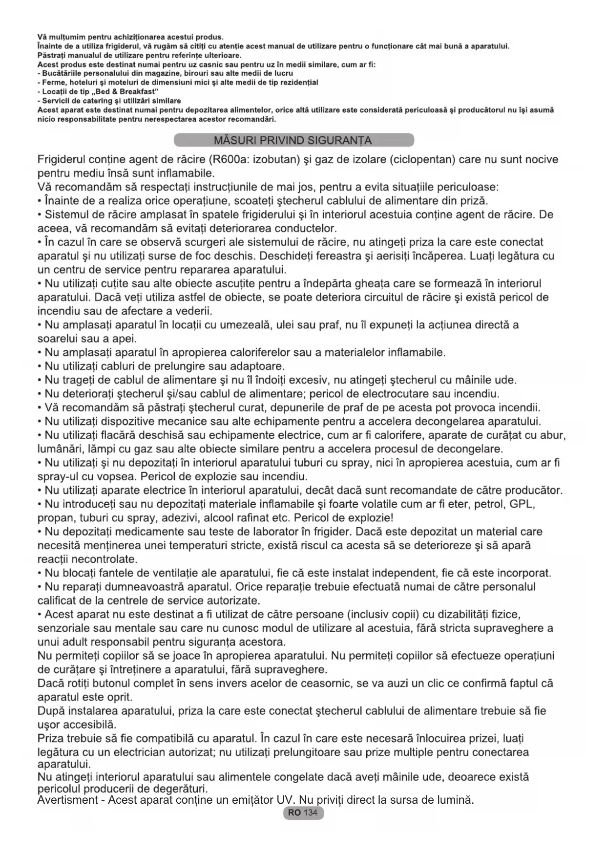 - Producătorul nu îşi asumă nicio responsabilitate în cazul în care aceste măsuri de siguranţă nu sunt respectate. Scoateţi toate materialele de ambalare de pe exteriorul şi din interiorul aparatului şi curăţaţi interiorul aparatului cu o soluţie de apă şi bicarbonat de sodiu sau un detergent neutru. După instalare, aşteptaţi 2-3 ore pentru a lăsa aparatul să se stabilizeze la temperatura normală de funcţionare înainte de a introduce alimentele. Dacă deconectaţi cablul de alimentare, aşteptaţi cel puţin cinci minute înainte de a repune aparatul în funcţiune. Apoi, aparatul este gata de utilizare. AVERTIZĂRI: