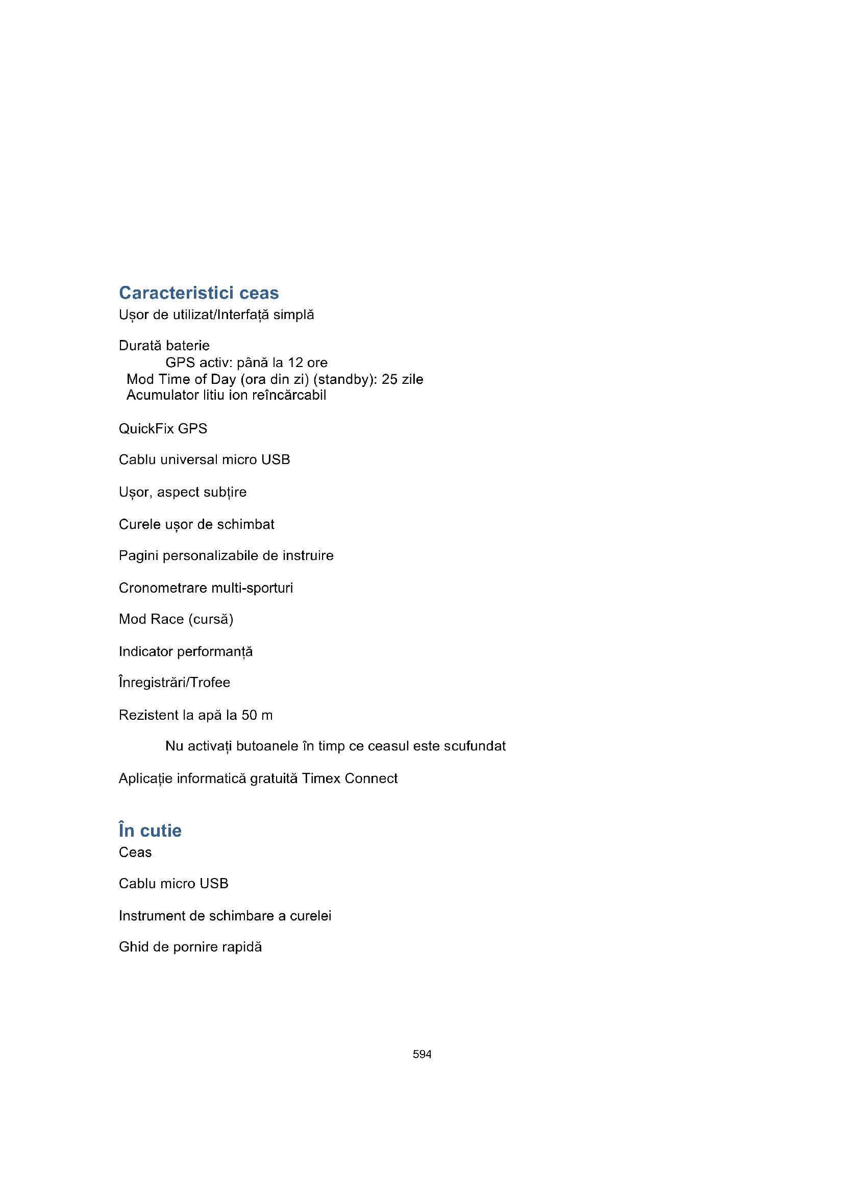 Caracteristici ceas Ușor de utilizat/Interfață simplă Durată baterie GPS activ: până la 12 ore Mod Time of Day (ora din zi) (standby): 25 zile Acumulator litiu ion reîncărcabil QuickFix GPS Cablu universal micro USB Ușor, aspect subțire Curele ușor de schimbat Pagini personalizabile de instruire Cronometrare multi-sporturi Mod Race (cursă) Indicator performanță Înregistră ri/Trofee Rezistent la apă la 50 m Nu activați butoanele în timp ce ceasul este scufundat Aplicație informatică gratuită Timex Connect În cutie Ceas Cablu micro USB Instrument de schimbare a curelei Ghid de pornire rapidă595 Punerea în funcțiune Acest manual al utilizatorului vă va indica toate caracteristicile și funcțiile noului dvs. ceas TIMEX