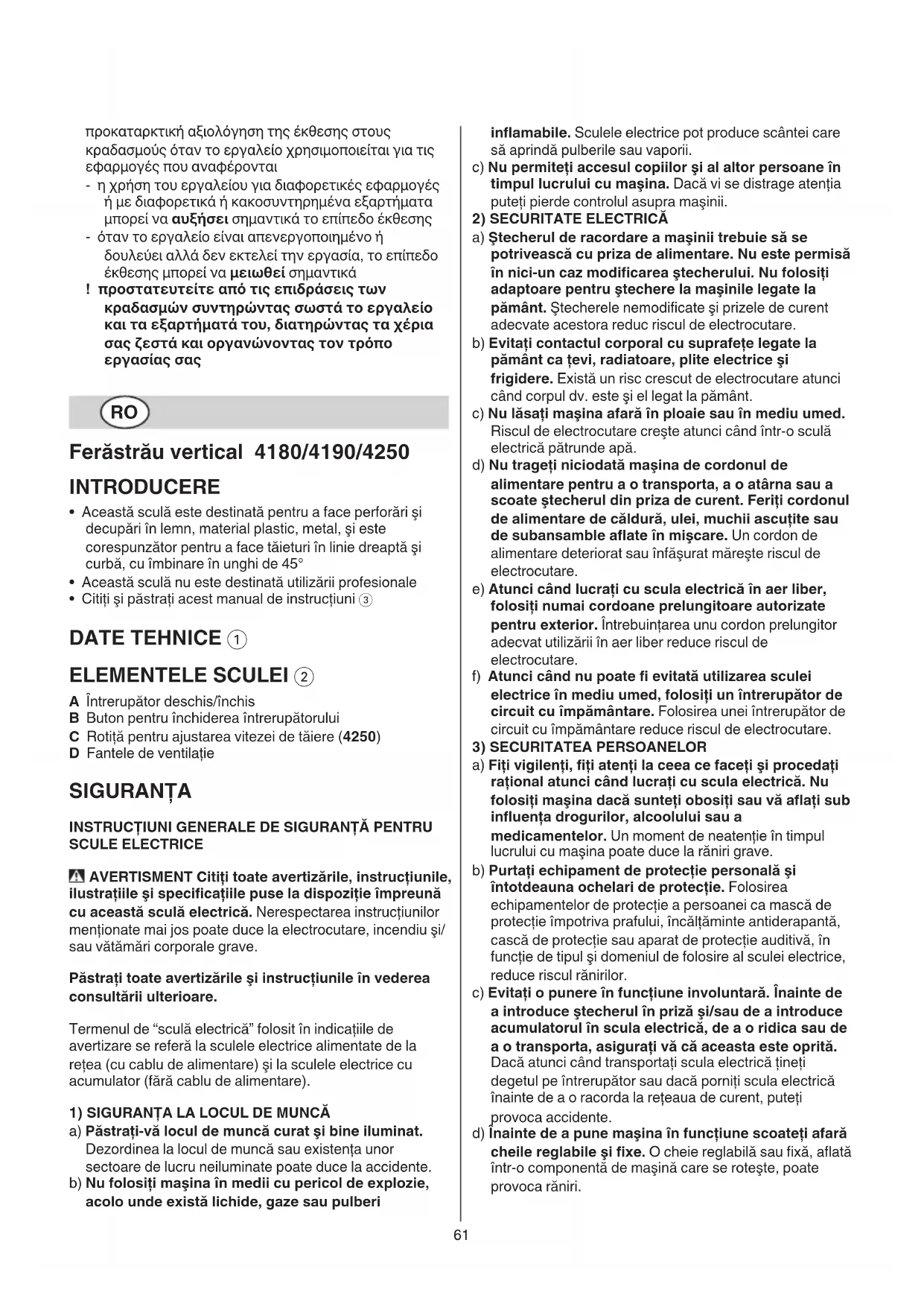 - Citiţi şi păstraţi acest manual de instrucţiuni 3 DATE TEHNICE 1 ELEMENTELE SCULEI 2 A Întrerupător deschis/închis B Buton pentru închiderea întrerupătorului C Rotiţă pentru ajustarea vitezei de tăiere (4250) D Fantele de ventilaţie SIGURANŢA