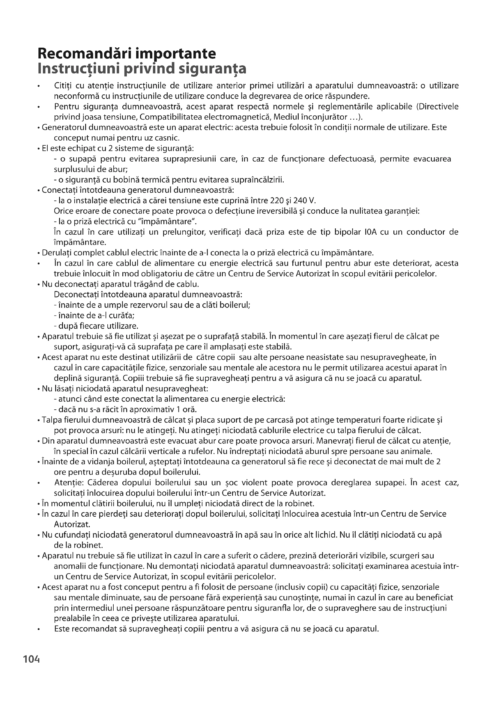 - Acest aparat nu a fost conceput pentru a fi folosit de persoane (inclusiv copii) cu capacităţi fizice, senzoriale sau mentale diminuate, sau de persoane fără experienţă sau cunoștinţe, numai în cazul în care au beneficiat prin intermediul unei persoane răspunzătoare pentru siguranfla lor, de o supraveghere sau de instrucţiuni prealabile în ceea ce privește utilizarea aparatului.