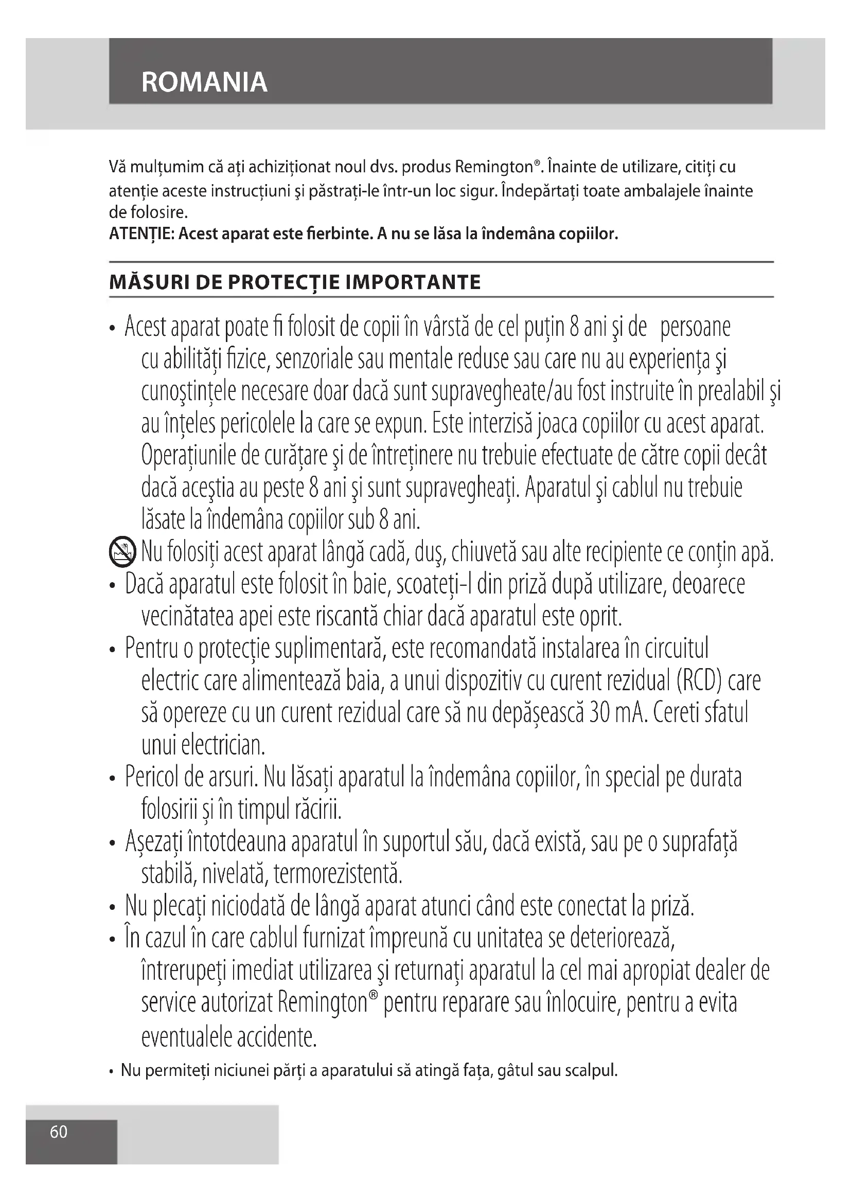 AE60 Vă mulţumim că aţi achiziţionat noul dvs. produs Remington®. Înainte de utilizare, citiţi cu atenţie aceste instrucţiuni şi păstraţi-le într-un loc sigur. Îndepărtaţi toate ambalajele înainte de folosire. ATENŢIE: Acest aparat este erbinte. A nu se lăsa la îndemâna copiilor.