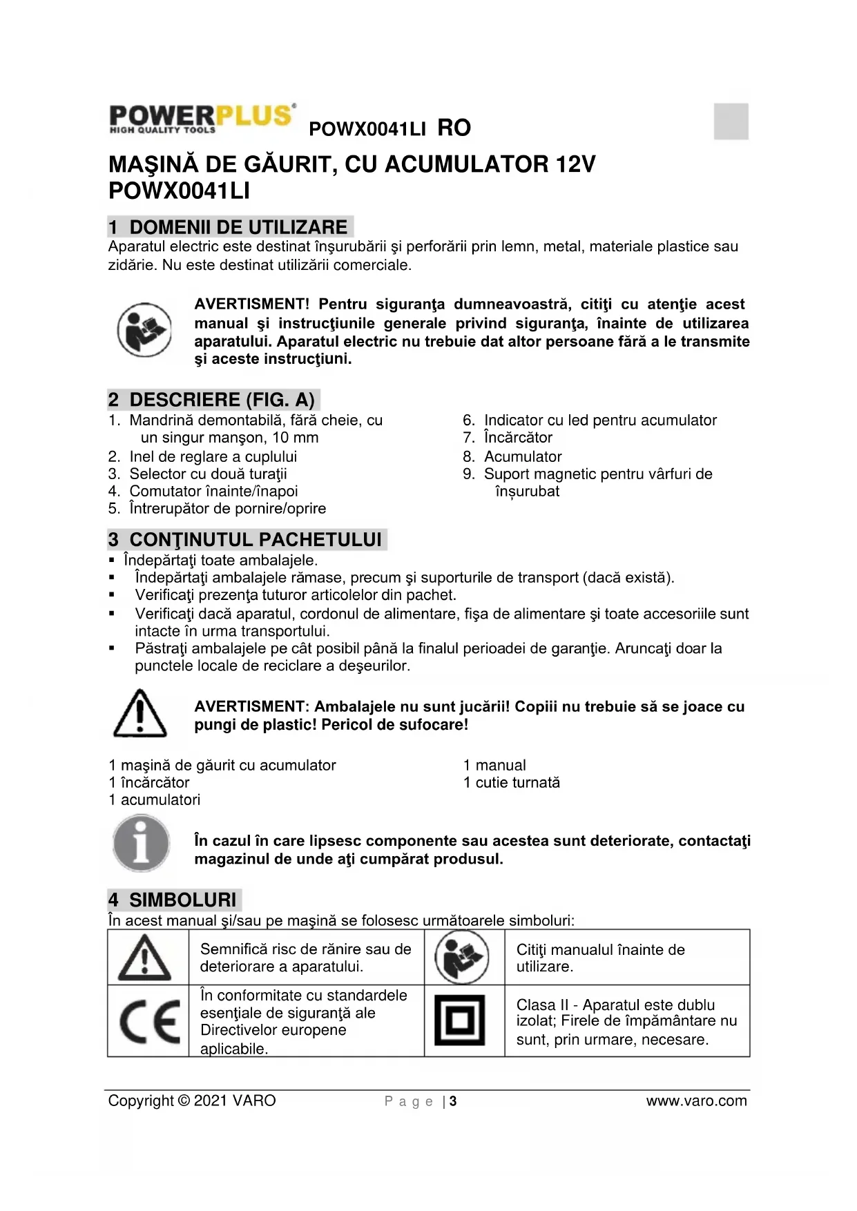 VARO N.V. - Vic. Van Rompuy N.V. Joseph Van Instraat 9 - BE2500 Lier - BELGIA, declară că produsul: Maşină de găurit cu acumulator marcă de comerţ: POWERplus model: POWX0041LI este în conformitate cu specificaţiile esenţiale şi alte prevederi relevante ale Directivelor Europene aplicabile, pe baza aplicării standardelor europene armonizate. Orice modificare neautorizată a aparatelor atrage după sine anularea acestei declaraţii. Directivele europene (inclusiv, dacă este cazul, amendamentele lor, până la data semnăturii); 2014/30/EU 2006/42/EC 2011/65/EU Standardele europene armonizate (inclusiv, dacă este cazul, amendamentele lor, până la data semnăturii); EN62841-1 : 2015 EN62841-2-1 : 2018 EN55014-1 : 2017 EN55014-2 : 2015 Persoana care păstrează documentaţia tehnică : Philippe Vankerkhove, VARO – Vic. Van Rompuy N.V. Subsemnatul acţionează în numele Directorului general executiv al societăţii, Ludo Mertens Divizia de reglementare – Director de conformitate 05/07/2021, Lier - BelgiumPOWX0041LI PL Copyright © 2021 VARO P a g e | 1 www.varo.com 1 ZASTOSOWANIE ........................................................................... 3