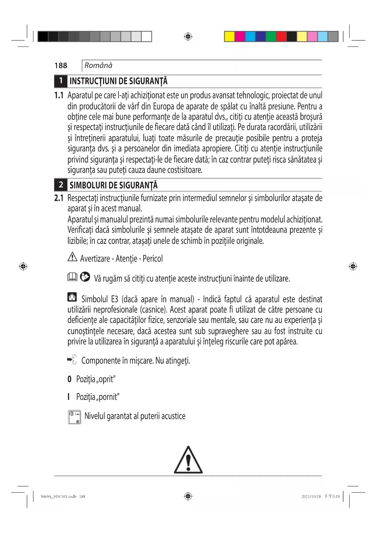 aparat şi în acest manual. Aparatul şi manualul prezintă numai simbolurile relevante pentru modelul achiziţionat. Verificaţi dacă simbolurile şi semnele ataşate de aparat sunt întotdeauna prezente şi lizibile; în caz contrar, ataşaţi unele de schimb în poziţiile originale. Avertizare - Atenţie - Pericol Vă rugăm să citiţi cu atenţie aceste instrucţiuni înainte de utilizare. Simbolul E3 (dacă apare în manual) - Indică faptul că aparatul este destinat utilizării neprofesionale (casnice). Acest aparat poate fi utilizat de către persoane cu deficienţe ale capacităţilor fizice, senzoriale sau mentale, sau care nu au experienţa şi cunoştinţele necesare, dacă acestea sunt sub supraveghere sau au fost instruite cu privire la utilizarea în siguranţă a aparatului şi înţeleg riscurile care pot apărea. Componente în mişcare. Nu atingeţi. 0 Poziţia „oprit” I Poziţia „pornit” Nivelul garantat al puterii acustice 94694_HW101.indb 18894694_HW101.indb 188 2021/10/18 下午5:192021/10/18 下午5:19189 Română Semnul de interzicere, informează utilizatorii asupra faptului că este posibil ca reglementările locale să interzică racordarea produsului la sistemul de alimentare cu apă potabilă. Semnul de pericol, avertizează utilizatorii să nu îndrepte jetul de apă spre persoane, animale, echipamente electrice sau spre aparatul în sine. Acest produs este evaluat în clasa de izolaţie II. Aceasta înseamnă că are izolaţie îmbunătăţită sau dublă (numai dacă simbolul există pe aparat). Produsul este în conformitate cu directivele europene relevante. Simbolul E1 - Indică faptul că aparatul nu trebuie eliminat împreună cu deşeurile municipale; acesta poate fi predat distribuitorului la achiziţia unui aparat nou. Componentele electrice şi electronice ale aparatului nu trebuie reutilizate în mod necorespunzător, deoarece conţin substanţe periculoase pentru sănătate. Doar pentru ţările din cadrul UE Din cauza prezenței componentelor periculoase în echipament, echipamentul electric şi electronic folosit poate avea un efect negativ asupra mediului şi sănătății umane. Nu eliminați aparatele electrice şi electronice împreună cu gunoiul menajer! În conformitate cu Directiva europeană privind deşeurile de echipamente electrice şi electronice şi cu adaptarea sa în legislația națională, echipamentele electrice şi electronice folosite trebuie colectate separat şi livrate la un centru de colectare separat pentru deşeurile municipale, care respectă reglementările privind protecția mediului. Acest lucru este indicat prin simbolul care reprezintă o pubelă cu roți barată cu o cruce, aplicat pe echipament. Purtaţi apărători pentru urechi. Purtaţi o mască de protecţie. Purtaţi protecţie respiratorie. Purtaţi mănuşi de protecţie. Purtaţi încălţăminte de protecţie. Purtaţi îmbrăcăminte de protecţie. 94694_HW101.indb 18994694_HW101.indb 189 2021/10/18 下午5:192021/10/18 下午5:19190 Română
