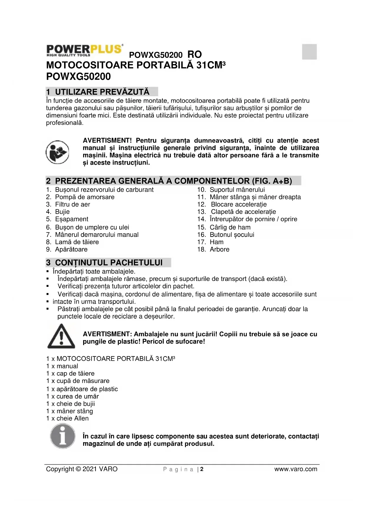 - Dacă a fost utilizat mașina, lăsați-l să se răcească minim 15 minute înainte de a-l încărca în vehiculul de transport.POWXG50200 RO Copyright © 2021 VARO P a g i n a | 13 www.varo.com
