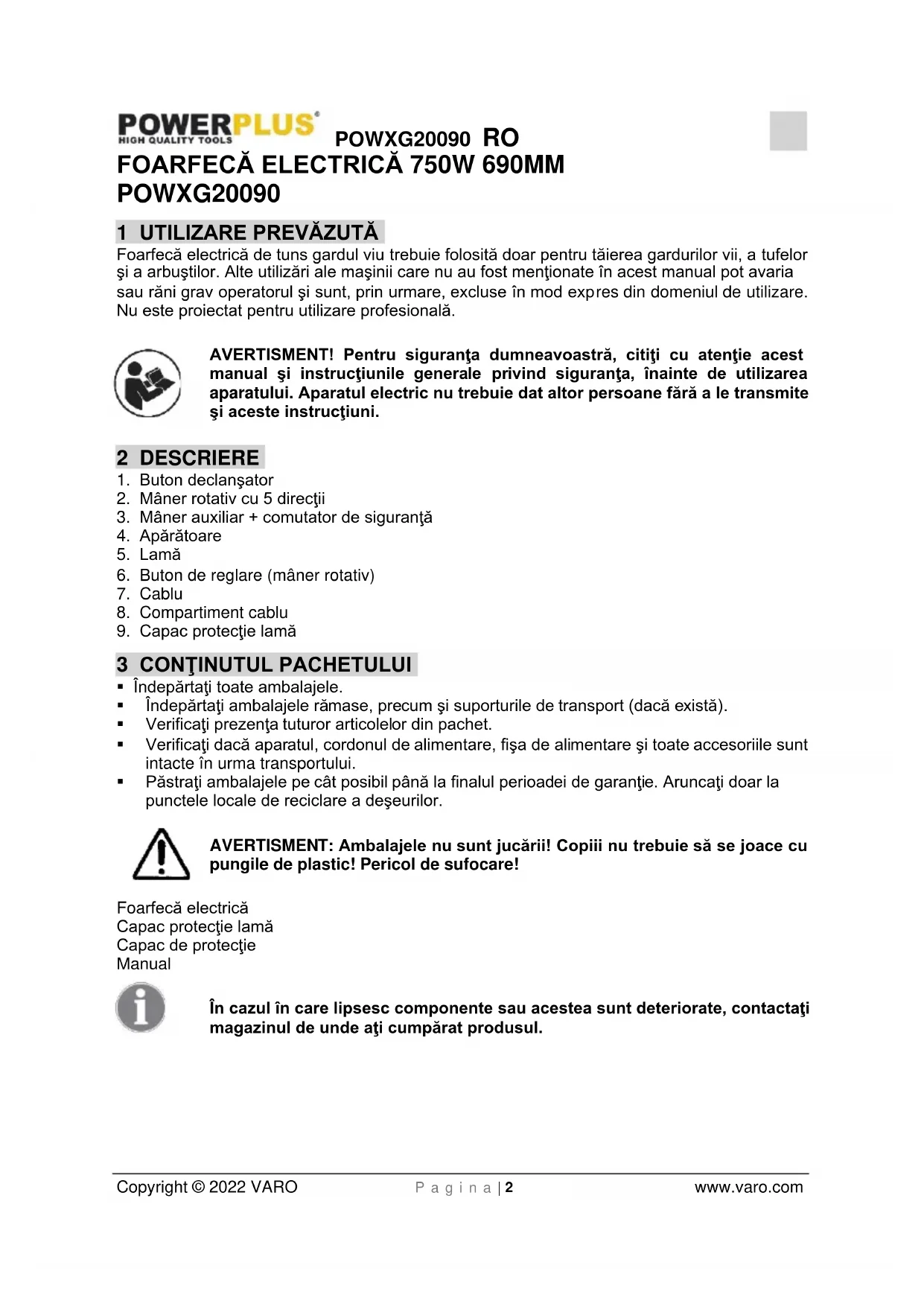 - Păstraţi piesele de tăiere ascuţite şi curate. Sculele aşchietoare întreţinute corespunzător, având lamele de tăiere ascuţite, se blochează mai greu şi sunt mai uşor de controlat.POWXG20090 RO Copyright © 2022 VARO P a g i n a | 5 www.varo.com