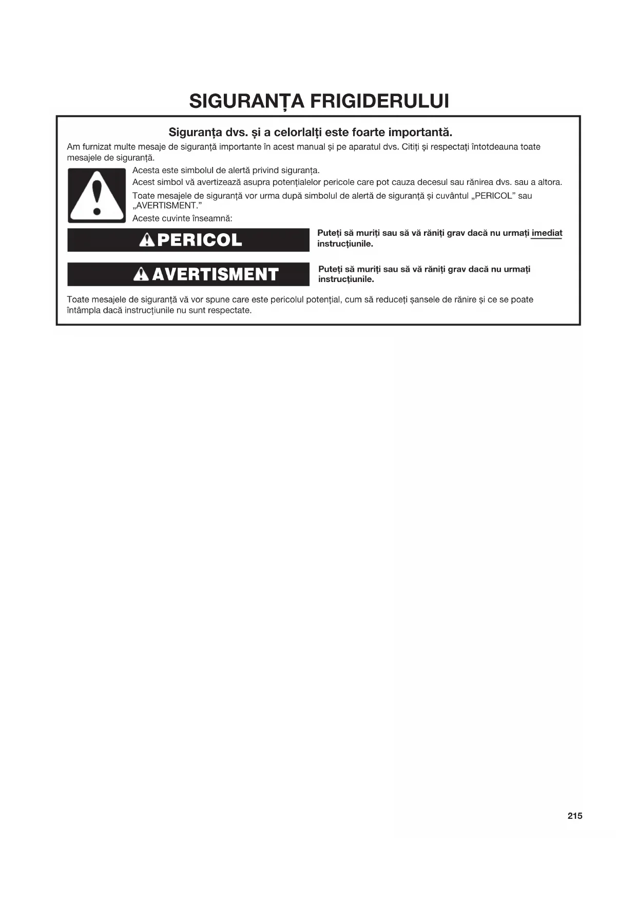 Puteți să muriți sau să vă răniți grav dacă nu urmați imediat instrucțiunile. Puteți să muriți sau să vă răniți grav dacă nu urmați instrucțiunile. Toate mesajele de siguranță vă vor spune care este pericolul potențial, cum să reduceți șansele de rănire și ce se poate întâmpla dacă instrucțiunile nu sunt respectate. Siguranța dvs. și a celorlalți este foarte importantă. Am furnizat multe mesaje de siguranță importante în acest manual și pe aparatul dvs. Citiți și respectați întotdeauna toate mesajele de siguranță. Acesta este simbolul de alertă privind siguranța. Acest simbol vă avertizează asupra potențialelor pericole care pot cauza decesul sau rănirea dvs. sau a altora. Toate mesajele de siguranță vor urma după simbolul de alertă de siguranță și cuvântul „PERICOL” sau „AVERTISMENT.” Aceste cuvinte înseamnă: PERICOL AVERTISMENT216