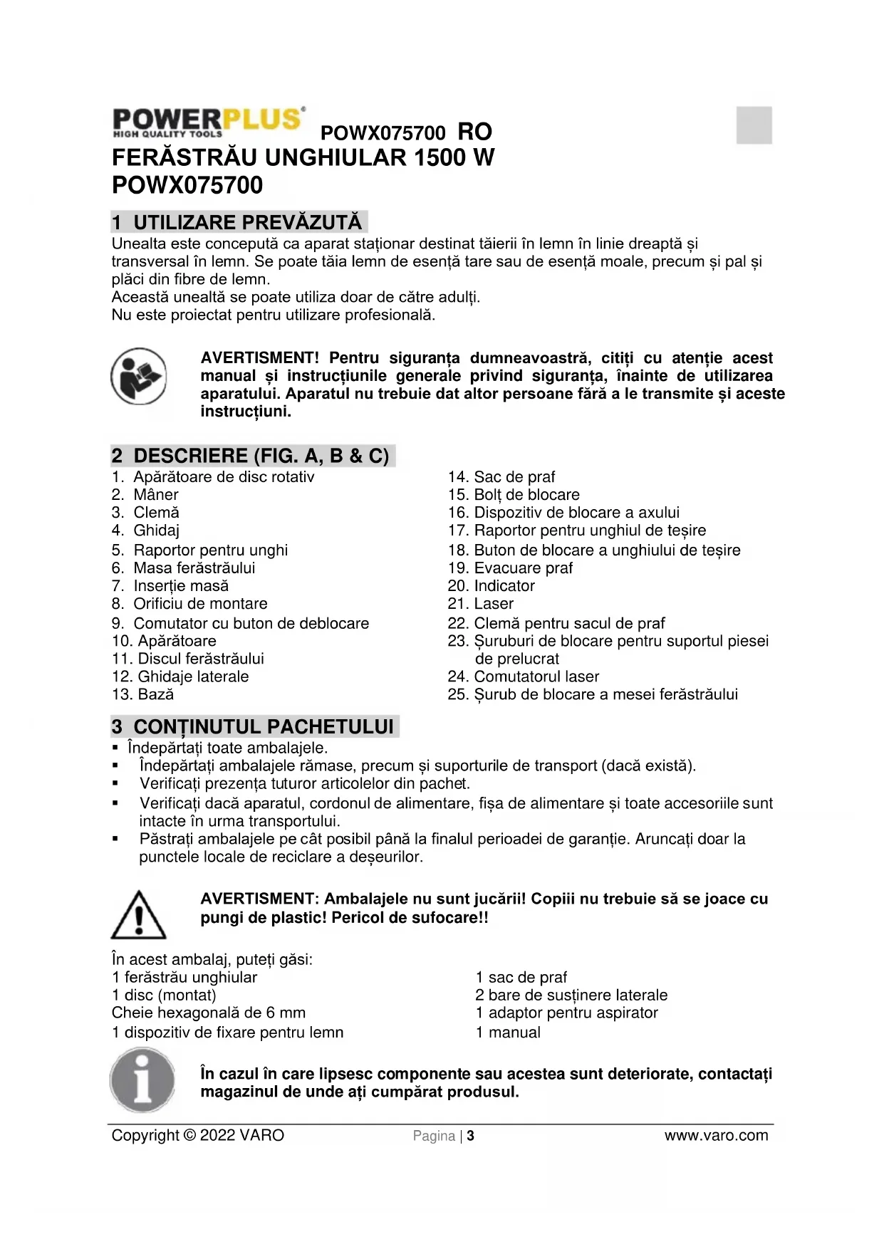 - Păstrați ambalajele pe cât posibil până la finalul perioadei de garanție. Aruncați doar la punctele locale de reciclare a deșeurilor. AVERTISMENT: Ambalajele nu sunt jucării! Copiii nu trebuie să se joace cu pungi de plastic! Pericol de sufocare!! În acest ambalaj, puteți găsi: 1 ferăstrău unghiular 1 disc (montat) Cheie hexagonală de 6 mm 1 dispozitiv de fixare pentru lemn 1 sac de praf 2 bare de susținere laterale 1 adaptor pentru aspirator 1 manual În cazul în care lipsesc componente sau acestea sunt deteriorate, contactați magazinul de unde ați cumpărat produsul.POWX075700 RO Copyright © 2022 VARO Pagina | 4 www.varo.com 4 SIMBOLURI În acest manual și / sau pe mașină se folosesc următoarele simboluri: