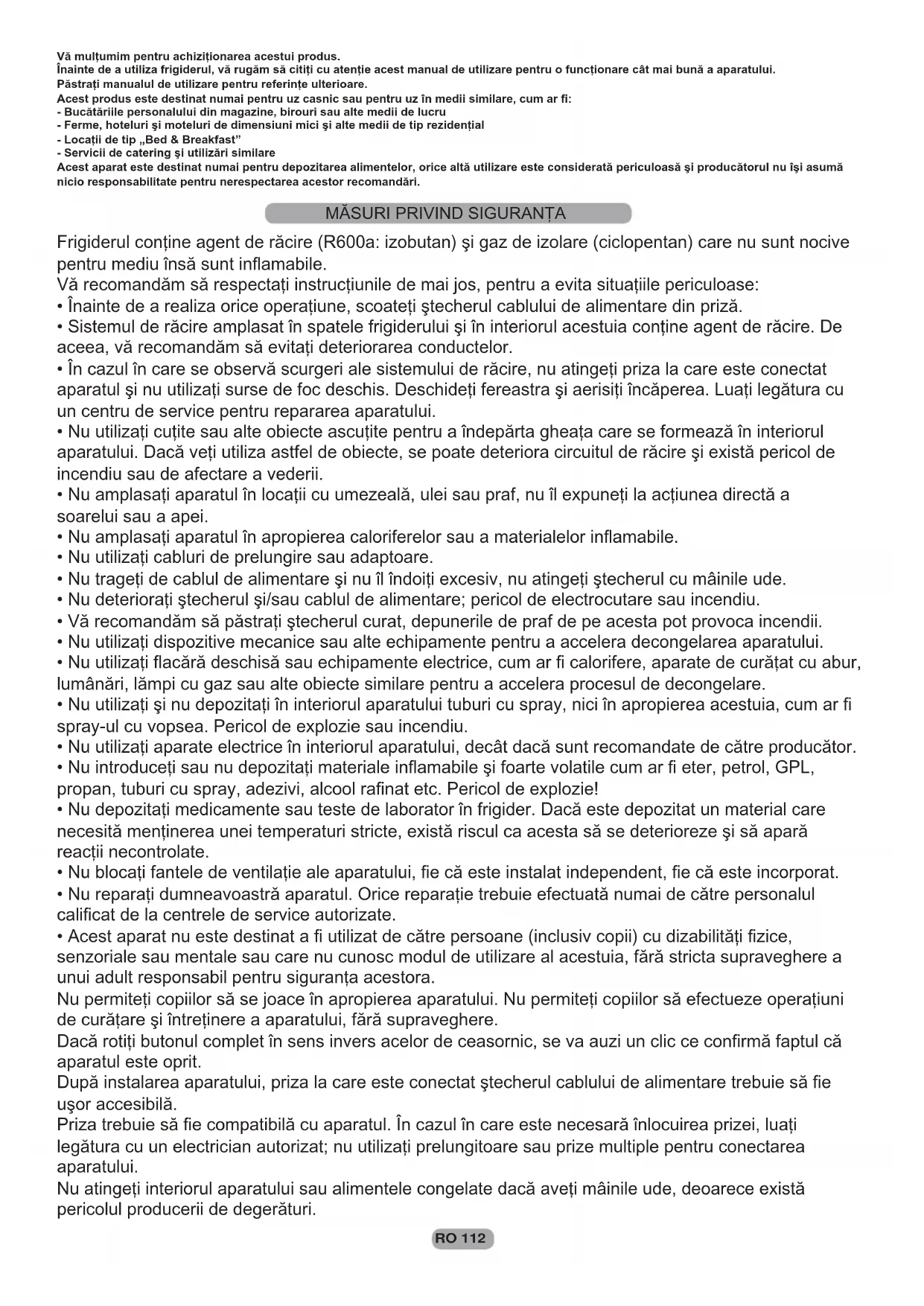 PROBLEME ÎN FUNCŢIONARE...................................... 120--120Vă mulţumim pentru achiziţionarea acestui produs. Înainte de a utiliza frigiderul, vă rugăm să citiţi cu atenţie acest manual de utilizare pentru o funcţionare cât mai bună a aparatului. Păstraţi manualul de utilizare pentru referinţe ulterioare. Acest produs este destinat numai pentru uz casnic sau pentru uz în medii similare, cum ar fi: - Bucătăriile personalului din magazine, birouri sau alte medii de lucru - Ferme, hoteluri şi moteluri de dimensiuni mici şi alte medii de tip rezidenţial - Locaţii de tip „Bed & Breakfast” - Servicii de catering şi utilizări similare Acest aparat este destinat numai pentru depozitarea alimentelor, orice altă utilizare este considerată periculoasă şi producătorul nu îşi asumă nicio responsabilitate pentru nerespectarea acestor recomandări. Frigiderul conţine agent de răcire (R600a: izobutan) şi gaz de izolare (ciclopentan) care nu sunt nocive pentru mediu însă sunt inflamabile. Vă recomandăm să respectaţi instrucţiunile de mai jos, pentru a evita situaţiile periculoase: