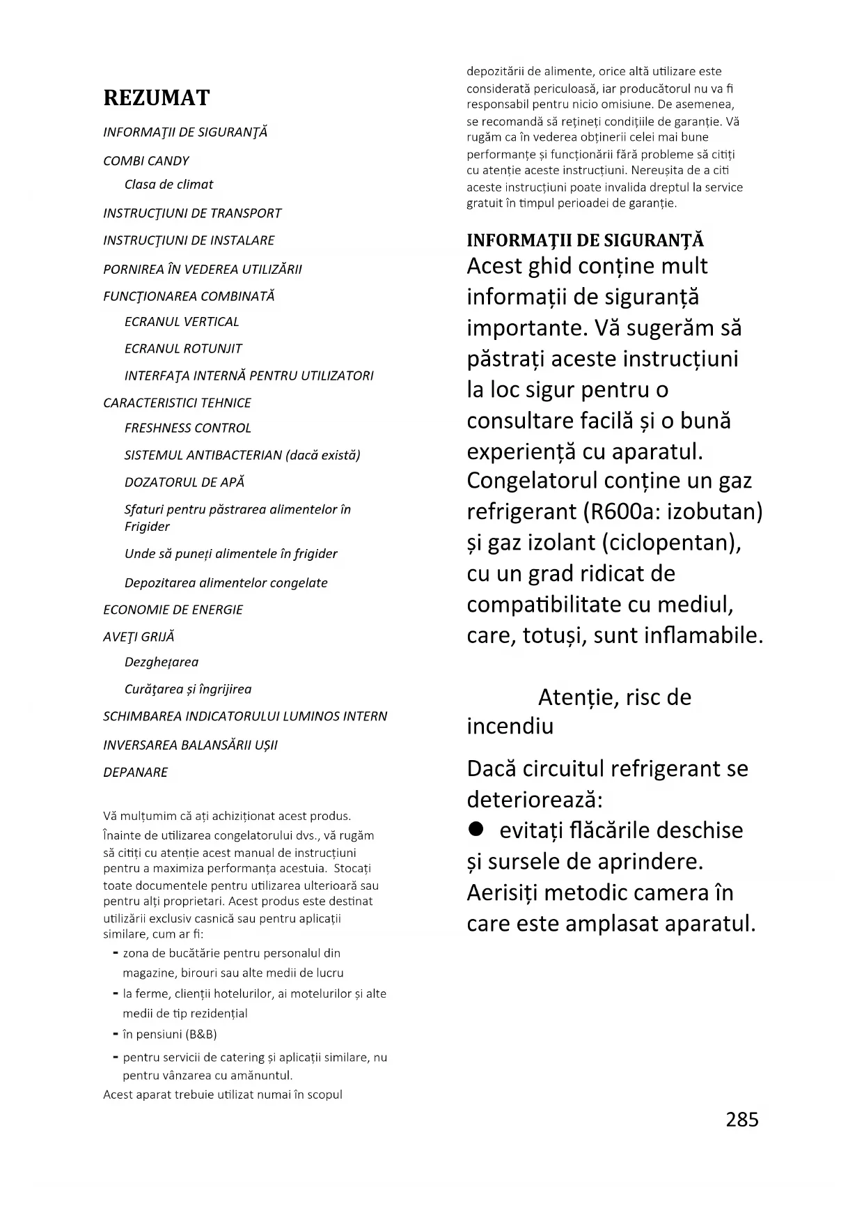 Termostaty, snímače teploty, dosky plošných spojov a svetelné zdroje, aspoň počas siedmich rokov od uvedenia posledného kusu daného modelu na trh rúčky a závesy dverí, poličky a košíky aspoň počas siedmich rokov a tesnenia dverí aspoň počas 10 rokov od uvedenia posledného kusu daného modelu na trh; Ďalšie informácie o produkte nájdete na https://eprel.ec.europa.eu/ alebo naskenujte QR na energetickom štítku dodávanom so spotrebičom.285 Română REZUMAT INFORMAŢII DE SIGURANŢĂ COMBI CANDY Clasa de climat INSTRUCŢIUNI DE TRANSPORT INSTRUCŢIUNI DE INSTALARE PORNIREA ÎN VEDEREA UTILIZĂRII FUNCŢIONAREA COMBINATĂ ECRANUL VERTICAL ECRANUL ROTUNJIT INTERFAŢA INTERNĂ PENTRU UTILIZATORI CARACTERISTICI TEHNICE FRESHNESS CONTROL SISTEMUL ANTIBACTERIAN (dacă există) DOZATORUL DE APĂ Sfaturi pentru păstrarea alimentelor în Frigider Unde să puneți alimentele în frigider Depozitarea alimentelor congelate ECONOMIE DE ENERGIE AVEŢI GRIJĂ Dezghețarea Curăţarea și îngrijirea SCHIMBAREA INDICATORULUI LUMINOS INTERN INVERSAREA BALANSĂRII UȘII DEPANARE Vă mulțumim că ați achiziționat acest produs. Înainte de utilizarea congelatorului dvs., vă rugăm să citiți cu atenție acest manual de instrucțiuni pentru a maximiza performanța acestuia. Stocați toate documentele pentru utilizarea ulterioară sau pentru alți proprietari. Acest produs este destinat utilizării exclusiv casnică sau pentru aplicații similare, cum ar fi: - zona de bucătărie pentru personalul din magazine, birouri sau alte medii de lucru - la ferme, clienții hotelurilor, ai motelurilor și alte medii de tip rezidențial - în pensiuni (B&B) - pentru servicii de catering și aplicații similare, nu pentru vânzarea cu amănuntul. Acest aparat trebuie utilizat numai în scopul depozitării de alimente, orice altă utilizare este considerată periculoasă, iar producătorul nu va fi responsabil pentru nicio omisiune. De asemenea, se recomandă să rețineți condițiile de garanție. Vă rugăm ca în vederea obținerii celei mai bune performanțe și funcționării fără probleme să citiți cu atenție aceste instrucțiuni. Nereușita de a citi aceste instrucțiuni poate invalida dreptul la service gratuit în timpul perioadei de garanție.