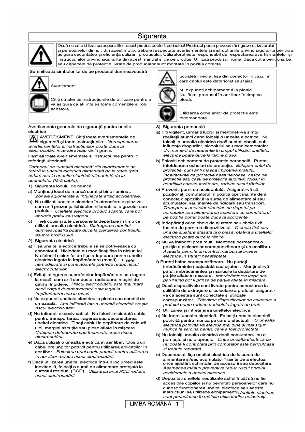 a) Nu forţaţi unealta electrică. Folosiţi unealta electrică potrivită pentru munca pe care o efectuaţi. O unealtă electrică potrivită va efectua mai bine și mai sigur munca la sarcina pentru care a fost proiectată. b) Nu folosiţi unealta electrică dacă comutatorul nu o pornește și nu o oprește. Orice unealtă electrică ce nu poate fi controlată prin comutator este periculoasă și trebuie reparată. c) Deconectaţi fișa uneltei electrice de la sursa de alimentare și/sau acumulator înainte de a efectua orice ajustări, schimbări de accesorii sau depozitare. Asemenea măsuri preventive reduc riscul pornirii accidentale a uneltei electrice. d) Depozitaţi uneltele neutilizate astfel încât să nu fie accesibile copiilor și nu permiteţi persoanelor care nu cunosc funcţionarea uneltei electrice sau aceste instrucţiuni să utilizeze echipamentul. Uneltele electrice sunt periculoase în mâinile utilizatorilor neinstruiţi. Dacă nu este utilizat corespunzător, acest produs poate fi periculos! Produsul poate provoca răni grave utilizatorului și persoanelor din jur, din acest motiv, trebuie respectate avertismentele și instrucţiunile privind siguranţa pentru a asigura securitatea și eficienţa utilizării produsului. Utilizatorul este responsabil de respectarea avertismentelor și instrucţiunilor privind siguranţa din acest manual și de pe produs. Utilizaţi produsul numai dacă cutia pentru iarbă sau capacele de protecţie livrate de producător sunt montate în poziţia corectă.