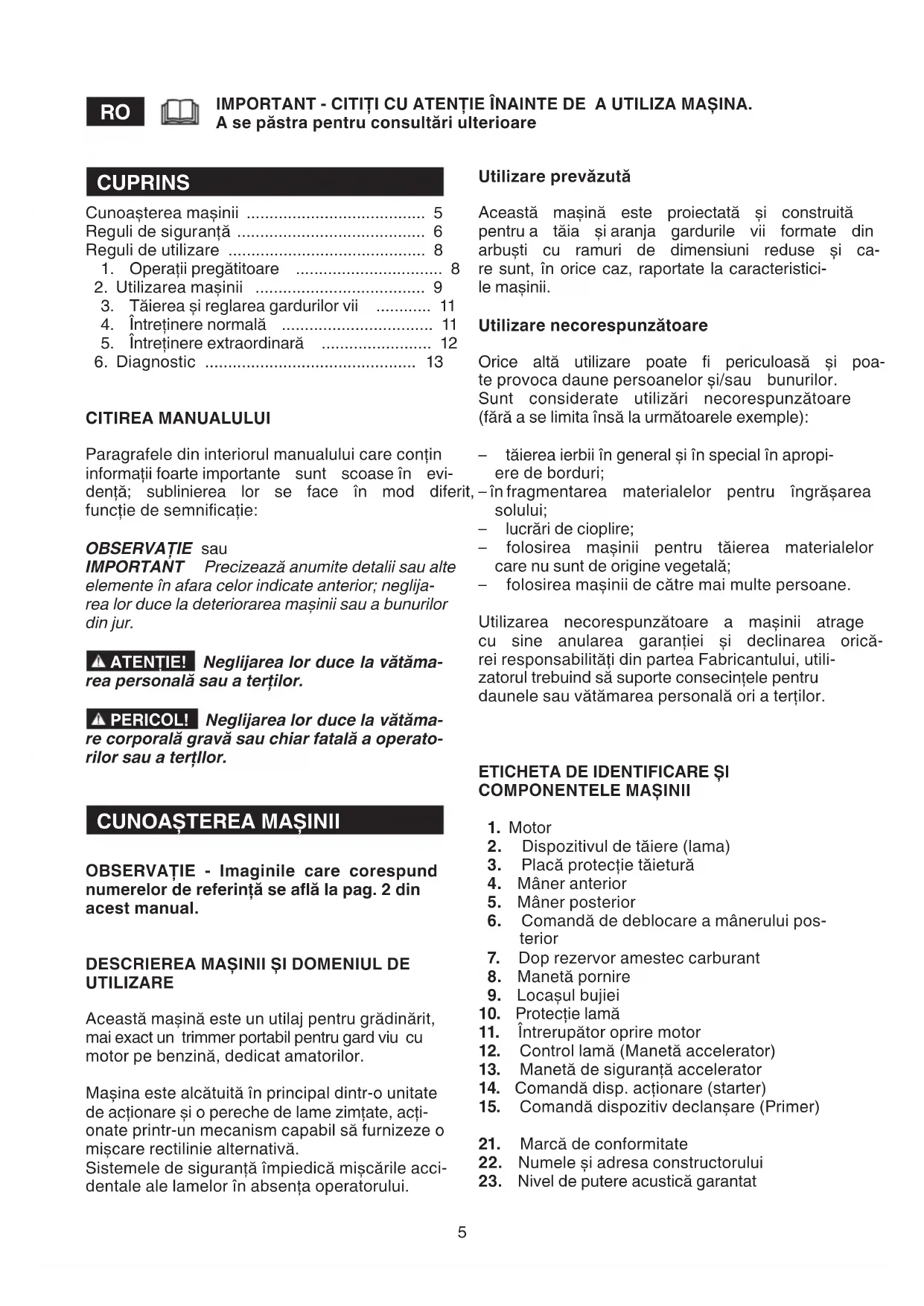 mínimo Regulação errada da car- buração Contatar o próprio Revendedor5 CUPRINS Cunoaşterea maşinii ....................................... 5 Reguli de siguranţă ......................................... 6 Reguli de utilizare ........................................... 8 1. Operaţii pregătitoare ................................ 8 2. Utilizarea maşinii ..................................... 9 3. Tăierea şi reglarea gardurilor vii ............ 11 4. Întreţinere normală ................................. 11 5. Întreţinere extraordinară ........................ 12 6. Diagnostic .............................................. 13 CITIREA MANUALULUI Paragrafele din interiorul manualului care conţin informaţii foarte importante sunt scoase în evi- denţă; sublinierea lor se face în mod diferit, în funcţie de semnicaţie: OBSERVAŢIE sau IMPORTANT Precizează anumite detalii sau alte elemente în afara celor indicate anterior; neglija- rea lor duce la deteriorarea maşinii sau a bunurilor din jur. ATENŢIE! Neglijarea lor duce la vătăma- rea personală sau a terţilor. PERICOL! Neglijarea lor duce la vătăma- re corporală gravă sau chiar fatală a operato- rilor sau a terţIlor.