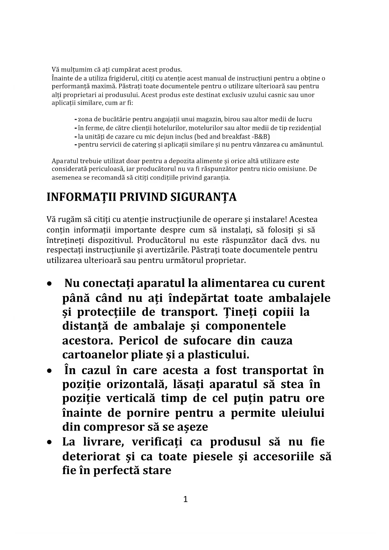 Vă mulțumim că ați cumpărat acest produs. Înainte de a utiliza frigiderul, citiți cu atenție acest manual de instrucțiuni pentru a obține o performanță maximă. Păstrați toate documentele pentru o utilizare ulterioară sau pentru alți proprietari ai produsului. Acest produs este destinat exclusiv uzului casnic sau unor aplicații similare, cum ar fi: - zona de bucătărie pentru angajații unui magazin, birou sau altor medii de lucru - în ferme, de către clienții hotelurilor, motelurilor sau altor medii de tip rezidențial - la unități de cazare cu mic dejun inclus (bed and breakfast -B&B) - pentru servicii de catering și aplicații similare și nu pentru vânzarea cu amănuntul. Apa ratul trebuie utilizat doar pentru a depozita alimente și orice altă utilizare este considerată periculoasă, iar producătorul nu va fi răspunzător pentru nicio omisiune. De asemenea se recomandă să citiți condițiile privind garanția.
