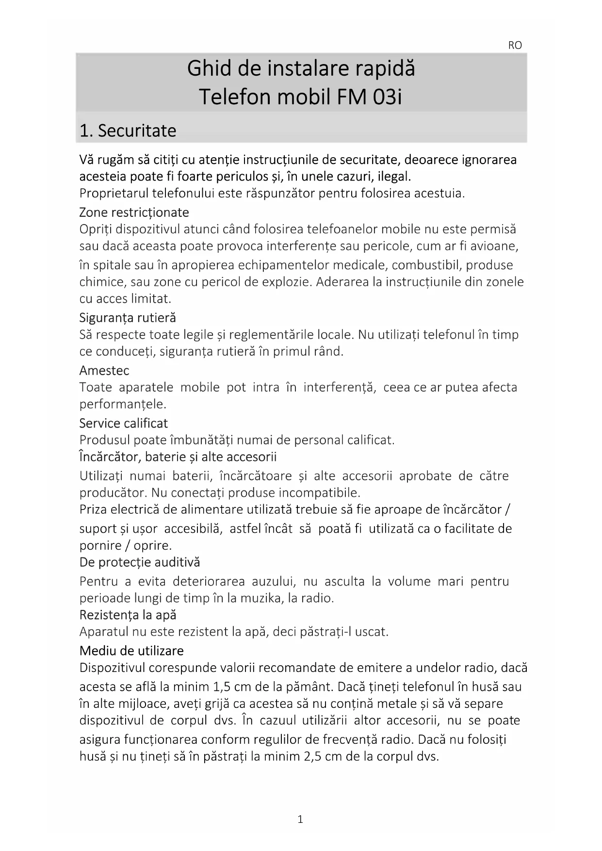 Vă rugăm să citiți cu atenție instrucțiunile de securitate, deoarece ignorarea acesteia poate fi foarte periculos și, în unele cazuri, ilegal. Proprietarul telefonului este răspunzător pentru folosirea acestuia. Zone restricționate Opriți dispozitivul atunci când folosirea telefoanelor mobile nu este permisă sau dacă aceasta poate provoca interferențe sau pericole, cum ar fi avioane, în spitale sau în apropierea echipamentelor medicale, combustibil, produse chimice, sau zone cu pericol de explozie. Aderarea la instrucțiunile din zonele cu acces limitat. Siguranța rutieră Să respecte toate legile și reglementările locale. Nu utilizați telefonul în timp ce conduceți, siguranța rutieră în primul rând. Amestec Toate aparatele mobile pot intra în interferență, ceea ce ar putea afecta performanțele. Service calificat Produsul poate îmbunătăți numai de personal calificat. Încărcător, baterie și alte accesorii Utilizați numai baterii, încărcătoare și alte accesorii aprobate de către producător. Nu conectați produse incompatibile. Priza electrică de alimentare utilizată trebuie să fie aproape de încărcător / suport și ușor accesibilă, astfel încât să poată fi utilizată ca o facilitate de pornire / oprire. De protecție auditivă Pentru a evita deteriorarea auzului, nu asculta la volume mari pentru perioade lungi de timp în la muzika, la radio. Rezistența la apă Aparatul nu este rezistent la apă, deci păstrați-l uscat. Mediu de utilizare Dispozitivul corespunde valorii recomandate de emitere a undelor radio, dacă acesta se află la minim 1,5 cm de la pământ. Dacă țineți telefonul în husă sau în alte mijloace, aveți grijă ca acestea să nu conțină metale și să vă separe dispozitivul de corpul dvs. În cazuul utilizării altor accesorii, nu se poate asigura funcționarea conform regulilor de frecvență radio. Dacă nu folosiți husă și nu țineți să în păstrați la minim 2,5 cm de la corpul dvs.RO