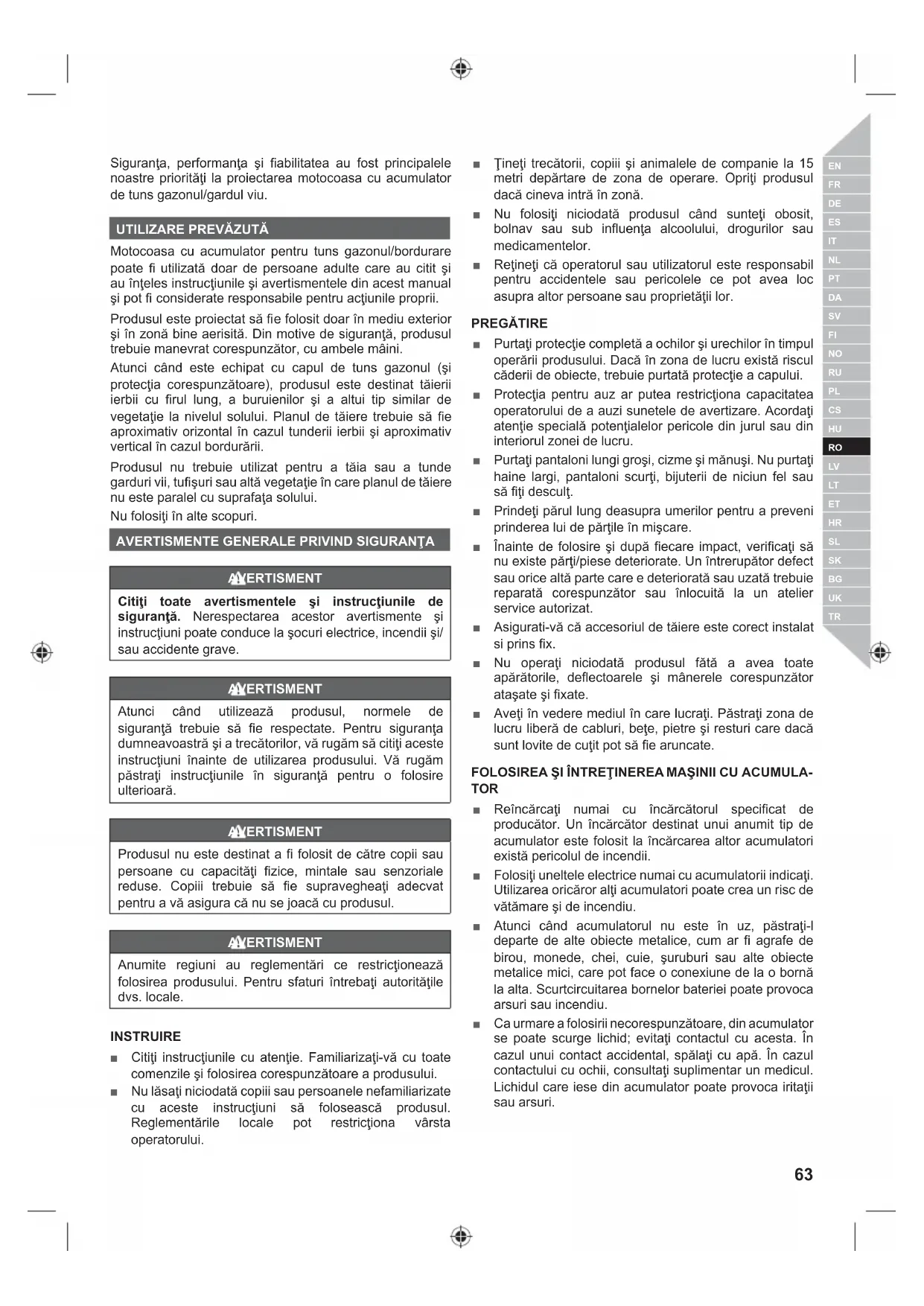 Motocoasa cu accumulator pentru tuns gazonul/bordurare poate fi utilizata doar de persone adulte care au citit si au inteles instructiunile si averismentele din acest manual si pot fi considerate responsabile pentru actiunile proprii.