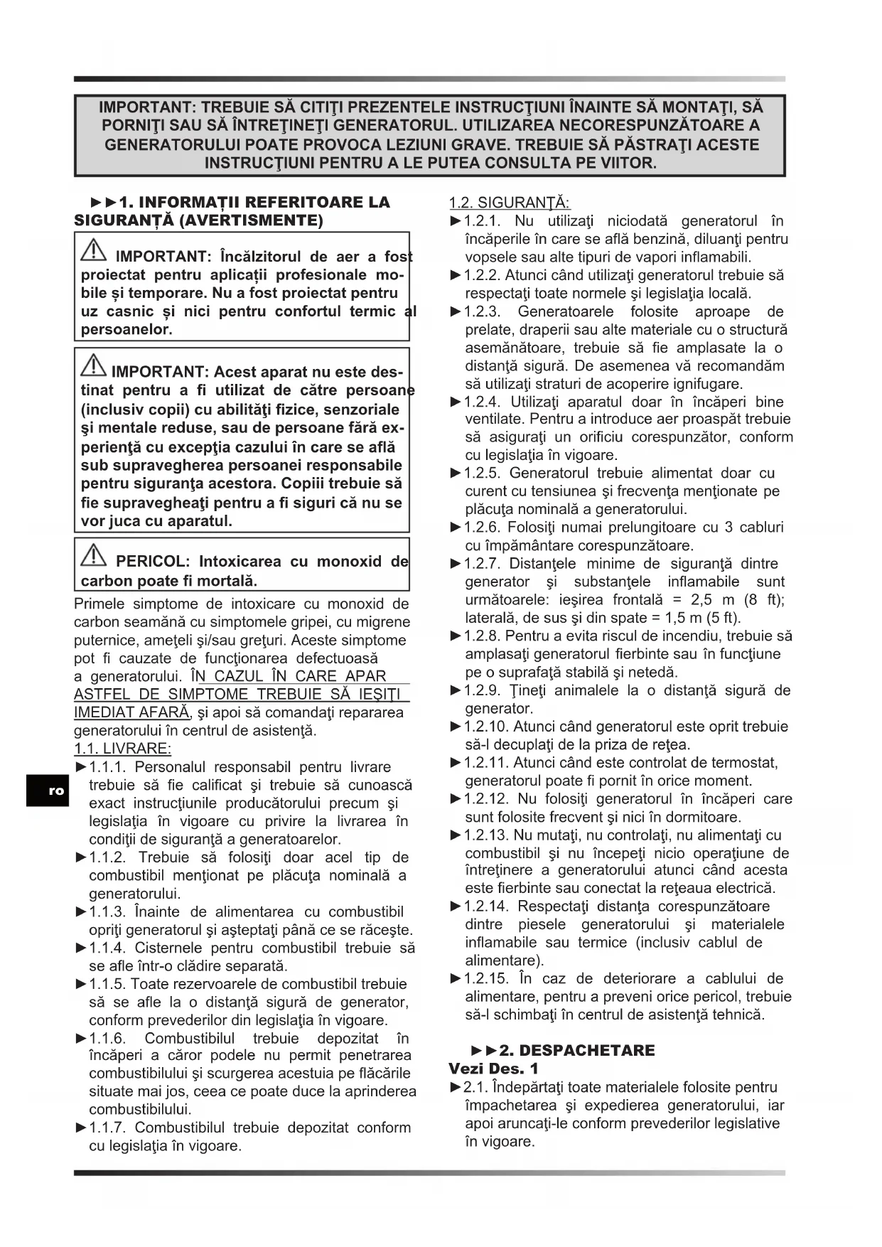 SIGURANŢĂ (AVERTISMENTE) IMPORTANT: Încălzitorul de aer a fost proiectat pentru aplicații profesionale mo- bile și temporare. Nu a fost proiectat pentru uz casnic și nici pentru confortul termic al persoanelor. IMPORTANT: Acest aparat nu este des- tinat pentru a utilizat de către persoane (inclusiv copii) cu abilităţi zice, senzoriale şi mentale reduse, sau de persoane fără ex- perienţă cu excepţia cazului în care se aă sub supravegherea persoanei responsabile pentru siguranţa acestora. Copiii trebuie să e supravegheaţi pentru a siguri că nu se vor juca cu aparatul. PERICOL: Intoxicarea cu monoxid de carbon poate mortală. Primele simptome de intoxicare cu monoxid de carbon seamănă cu simptomele gripei, cu migrene puternice, ameţeli şi/sau greţuri. Aceste simptome pot cauzate de funcţionarea defectuoasă a generatorului. ÎN CAZUL ÎN CARE APAR ASTFEL DE SIMPTOME TREBUIE SĂ IEŞIŢI IMEDIAT AFARĂ, şi apoi să comandaţi repararea generatorului în centrul de asistenţă. 1.1. LIVRARE: ►1.1.1. Personalul responsabil pentru livrare trebuie să e calicat şi trebuie să cunoască exact instrucţiunile producătorului precum şi legislaţia în vigoare cu privire la livrarea în condiţii de siguranţă a generatoarelor. ►1.1.2. Trebuie să folosiţi doar acel tip de combustibil menţionat pe plăcuţa nominală a generatorului. ►1.1.3. Înainte de alimentarea cu combustibil opriţi generatorul şi aşteptaţi până ce se răceşte. ►1.1.4. Cisternele pentru combustibil trebuie să se ae într-o clădire separată. ►1.1.5. Toate rezervoarele de combustibil trebuie să se ae la o distanţă sigură de generator, conform prevederilor din legislaţia în vigoare. ►1.1.6. Combustibilul trebuie depozitat în încăperi a căror podele nu permit penetrarea combustibilului şi scurgerea acestuia pe ăcările situate mai jos, ceea ce poate duce la aprinderea combustibilului. ►1.1.7. Combustibilul trebuie depozitat conform cu legislaţia în vigoare. 1.2. SIGURANŢĂ: ►1.2.1. Nu utilizaţi niciodată generatorul în încăperile în care se aă benzină, diluanţi pentru vopsele sau alte tipuri de vapori inamabili. ►1.2.2. Atunci când utilizaţi generatorul trebuie să respectaţi toate normele şi legislaţia locală. ►1.2.3. Generatoarele folosite aproape de prelate, draperii sau alte materiale cu o structură asemănătoare, trebuie să e amplasate la o distanţă sigură. De asemenea vă recomandăm să utilizaţi straturi de acoperire ignifugare. ►1.2.4. Utilizaţi aparatul doar în încăperi bine ventilate. Pentru a introduce aer proaspăt trebuie să asiguraţi un oriciu corespunzător, conform cu legislaţia în vigoare. ►1.2.5. Generatorul trebuie alimentat doar cu curent cu tensiunea şi frecvenţa menţionate pe plăcuţa nominală a generatorului. ►1.2.6. Folosiţi numai prelungitoare cu 3 cabluri cu împământare corespunzătoare. ►1.2.7. Distanţele minime de siguranţă dintre generator şi substanţele inamabile sunt următoarele: ieşirea frontală = 2,5 m (8 ft); laterală, de sus şi din spate = 1,5 m (5 ft). ►1.2.8. Pentru a evita riscul de incendiu, trebuie să amplasaţi generatorul erbinte sau în funcţiune pe o suprafaţă stabilă şi netedă. ►1.2.9. Ţineţi animalele la o distanţă sigură de generator. ►1.2.10. Atunci când generatorul este oprit trebuie să-l decuplaţi de la priza de reţea. ►1.2.11. Atunci când este controlat de termostat, generatorul poate pornit în orice moment. ►1.2.12. Nu folosiţi generatorul în încăperi care sunt folosite frecvent şi nici în dormitoare. ►1.2.13. Nu mutaţi, nu controlaţi, nu alimentaţi cu combustibil şi nu începeţi nicio operaţiune de întreţinere a generatorului atunci când acesta este erbinte sau conectat la reţeaua electrică. ►1.2.14. Respectaţi distanţa corespunzătoare dintre piesele generatorului şi materialele inamabile sau termice (inclusiv cablul de alimentare). ►1.2.15. În caz de deteriorare a cablului de alimentare, pentru a preveni orice pericol, trebuie să-l schimbaţi în centrul de asistenţă tehnică. ►►2. DESPACHETARE Vezi Des. 1 ►2.1. Îndepărtaţi toate materialele folosite pentru împachetarea şi expedierea generatorului, iar apoi aruncaţi-le conform prevederilor legislative în vigoare.