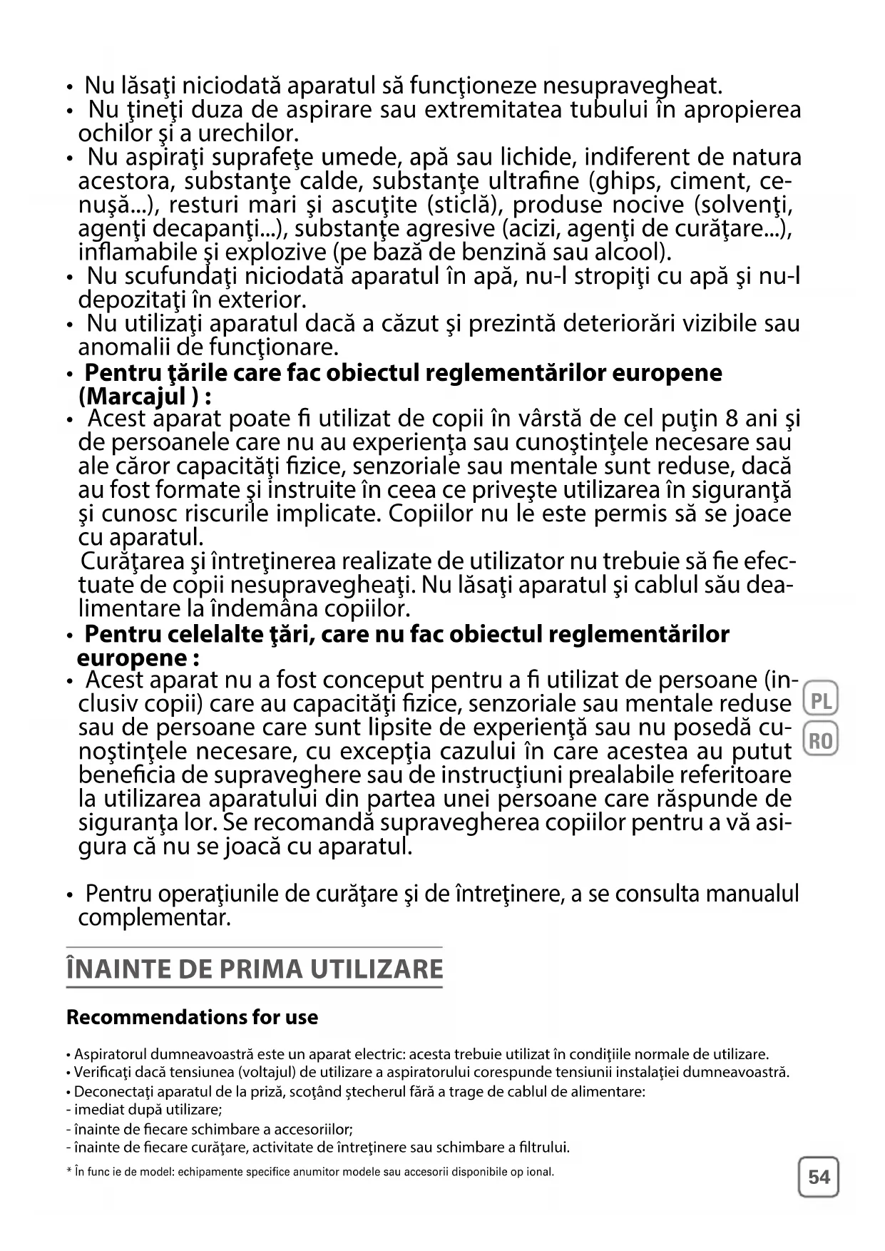 - Aspiratorul dumneavoastră este un aparat electric: acesta trebuie utilizat în condiţiile normale de utilizare.• Vericaţi dacă tensiunea (voltajul) de utilizare a aspiratorului corespunde tensiunii instalaţiei dumneavoastră.• Deconectaţi aparatul de la priză, scoţând ștecherul fără a trage de cablul de alimentare:- imediat după utilizare;- înainte de ecare schimbare a accesoriilor;- înainte de ecare curăţare, activitate de întreţinere sau schimbare a ltrului.* În funcčie de model: echipamente specifice anumitor modele sau accesorii disponibile opčional.