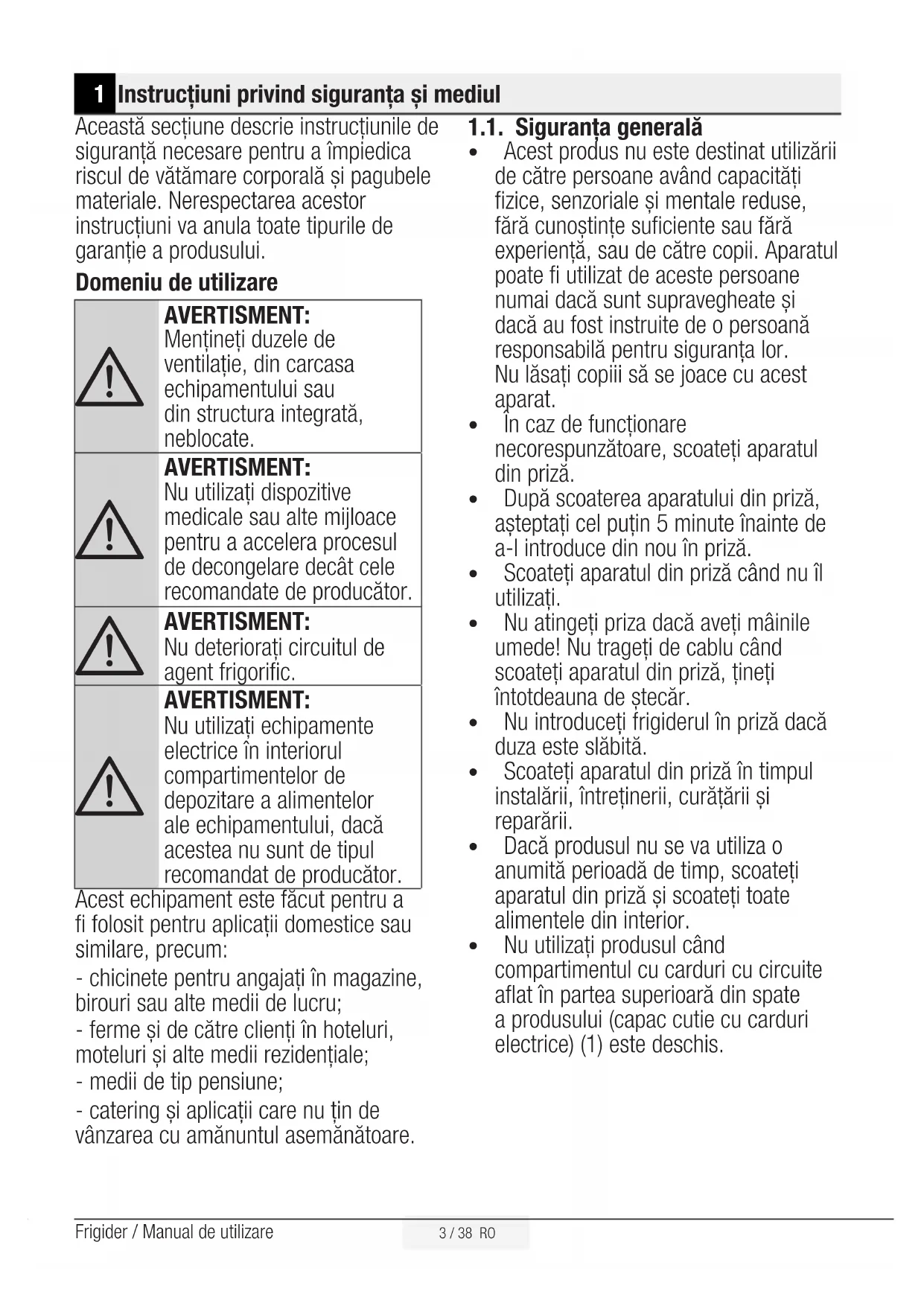 Pericol de electrocutare. Ambalajul produsului este fabricat din materiale reciclabile, în con- formitate cu Legislaţia naţională privind mediul înconjurător.2 / 38 RO Frigider / Manual de utilizare 1 Instrucţiuni privind siguranţa şi mediul 3 1.1. Siguranţa generală . . . . . . . . . . . . . . . . . . . 3