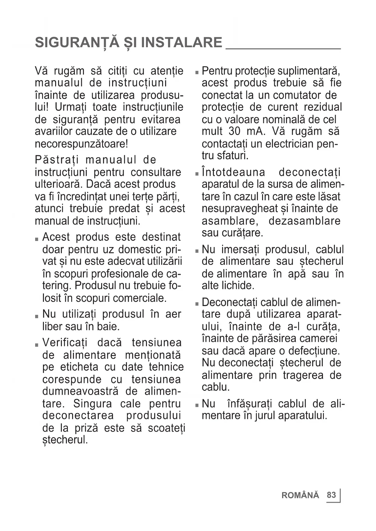 Pentru protecție suplimentară, acest produs trebuie să fie conectat la un comutator de protecție de curent rezidual cu o valoare nominală de cel mult 30 mA. Vă rugăm să contactați un electrician pen- tru sfaturi.