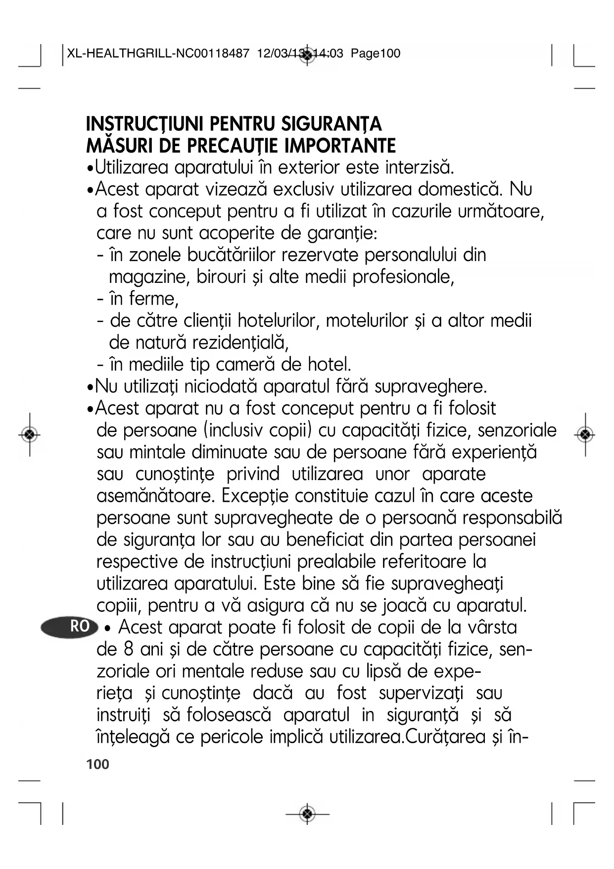XL-HEALTHGRILL-NC00118487 12/03/13 14:03 Page100treţinerea nu va fi facută de copii decât dacă au mai mult de 8 ani şi sunt supervizaţi. Păstraţi aparatul şi cablul de alimentare în locuri inaccesibile copiilor mai mici de 8 ani.