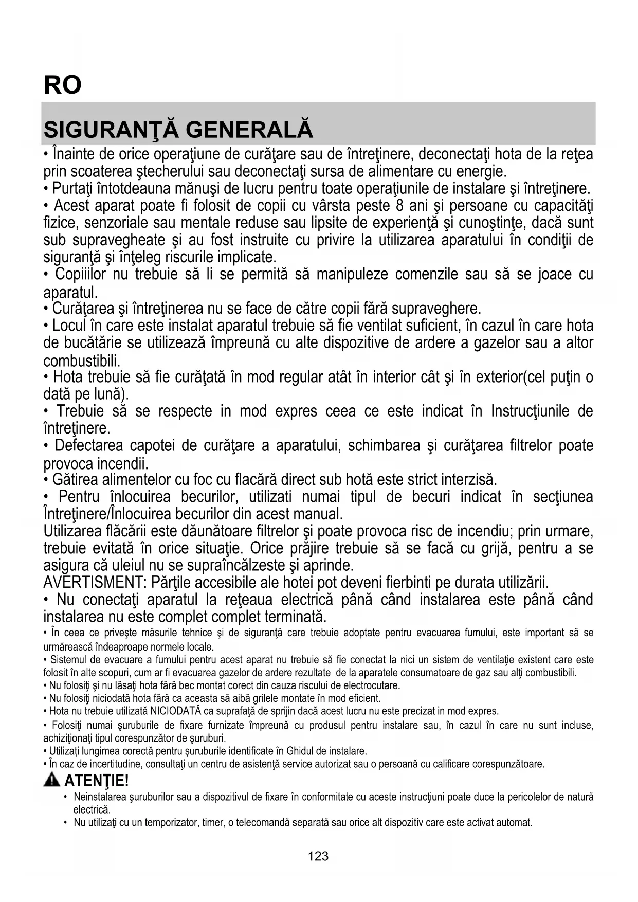 - Nu folosiţi niciodată hota fără ca aceasta să aibă grilele montate în mod eficient.
