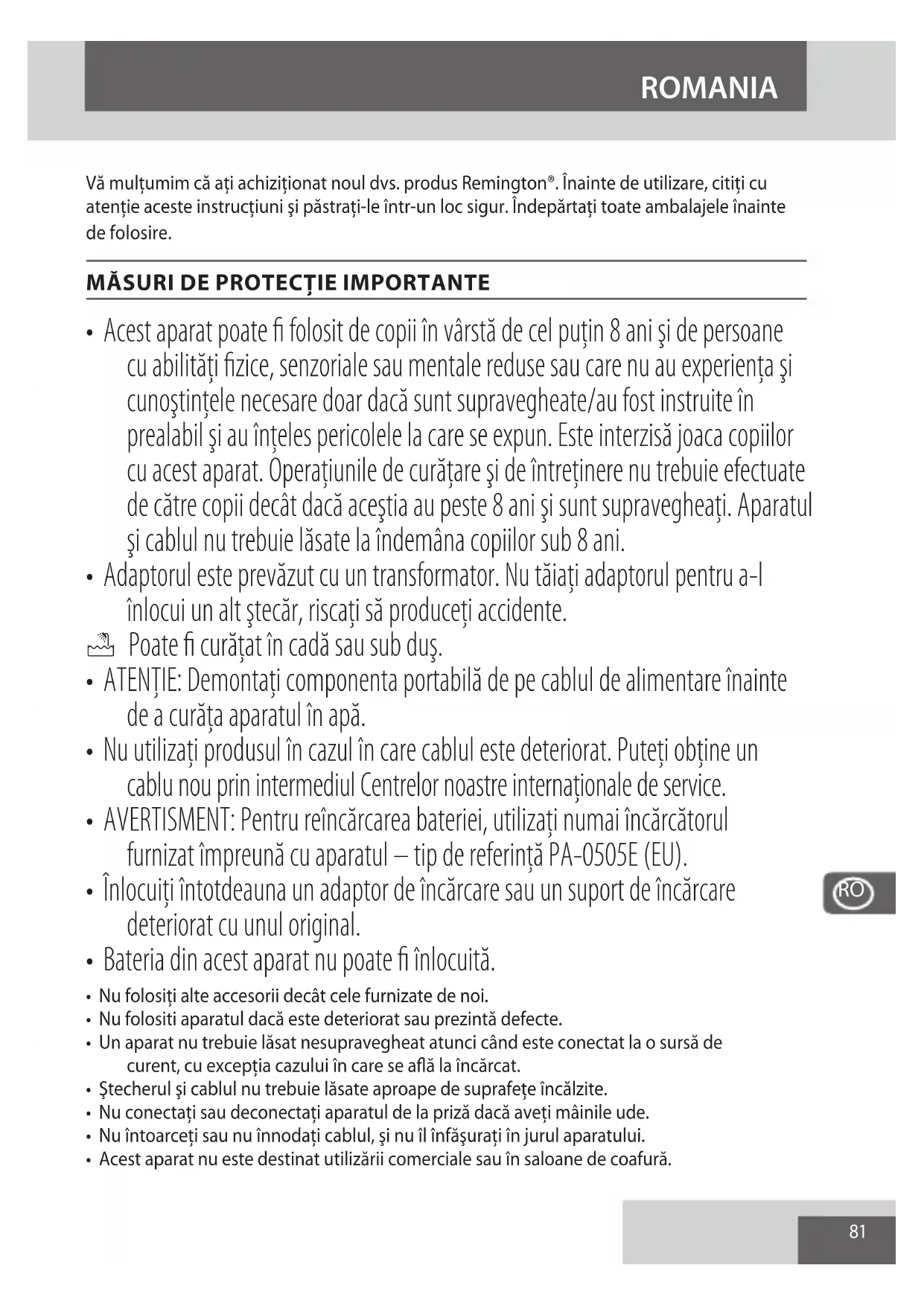Vă mulţumim că aţi achiziţionat noul dvs. produs Remington®. Înainte de utilizare, citiţi cu atenţie aceste instrucţiuni şi păstraţi-le într-un loc sigur. Îndepărtaţi toate ambalajele înainte de folosire.