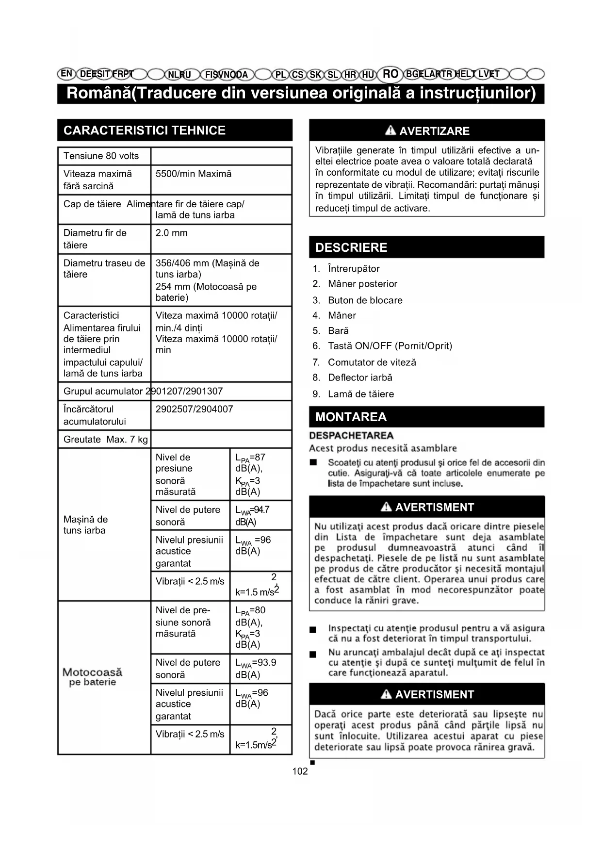 AVERTIZARE Vibrațiile generate în timpul utilizării efective a un- eltei electrice poate avea o valoare totală declarată în conformitate cu modul de utilizare; evitați riscurile reprezentate de vibrații. Recomandări: purtați mănuși în timpul utilizării. Limitați timpul de funcționare și reduceți timpul de activare. DESCRIERE