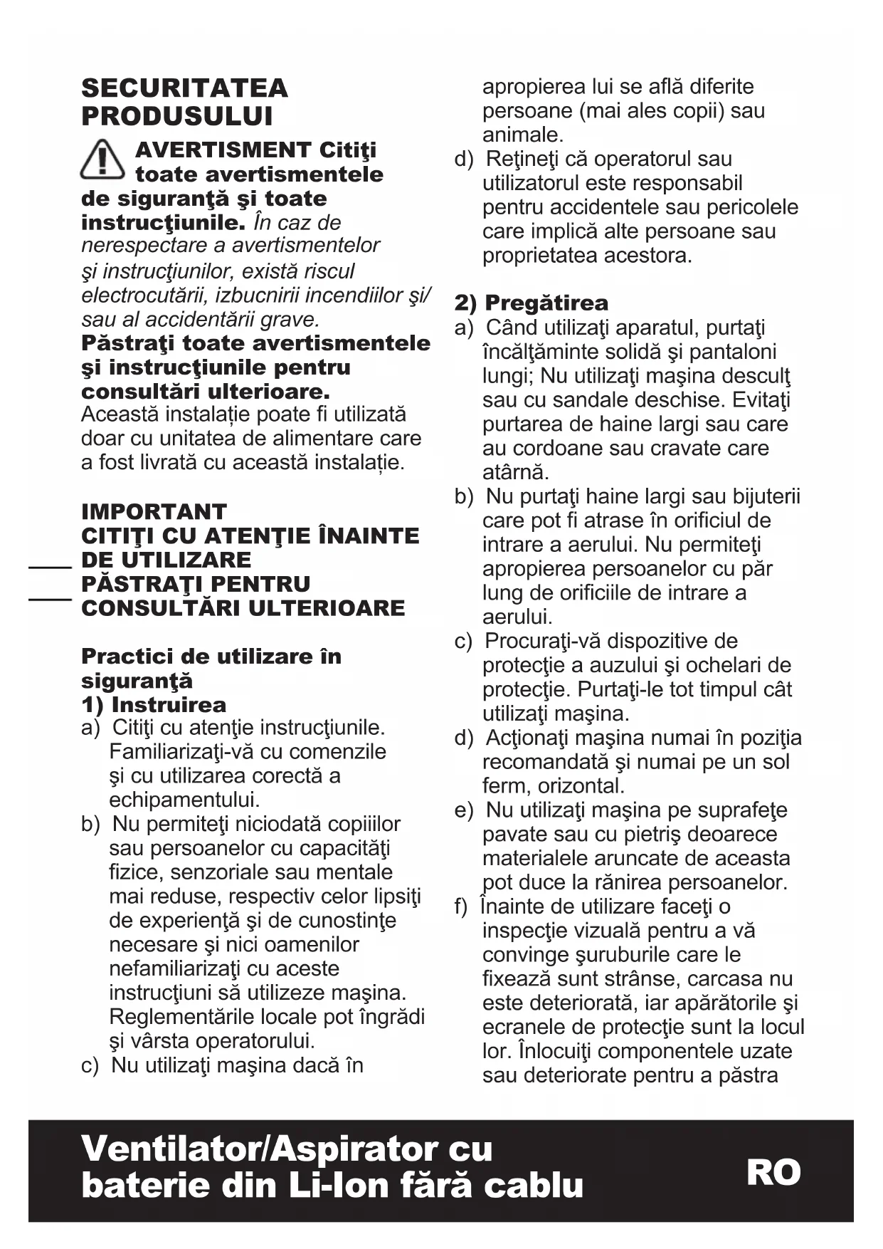 a) Când utilizaţi aparatul, purtaţi încălţăminte solidă şi pantaloni lungi; Nu utilizaţi maşina desculţ sau cu sandale deschise. Evitaţi purtarea de haine largi sau care au cordoane sau cravate care atârnă. b) Nu purtaţi haine largi sau bijuterii care pot atrase în oriciul de intrare a aerului. Nu permiteţi apropierea persoanelor cu păr lung de oriciile de intrare a aerului. c) Procuraţi-vă dispozitive de protecţie a auzului şi ochelari de protecţie. Purtaţi-le tot timpul cât utilizaţi maşina. d) Acţionaţi maşina numai în poziţia recomandată şi numai pe un sol ferm, orizontal. e) Nu utilizaţi maşina pe suprafeţe pavate sau cu pietriş deoarece materialele aruncate de aceasta pot duce la rănirea persoanelor. f) Înainte de utilizare faceţi o inspecţie vizuală pentru a vă convinge şuruburile care le xează sunt strânse, carcasa nu este deteriorată, iar apărătorile şi ecranele de protecţie sunt la locul lor. Înlocuiţi componentele uzate sau deteriorate pentru a păstra6766 Ventilator/Aspirator cu baterie din Li-Ion fără cablu