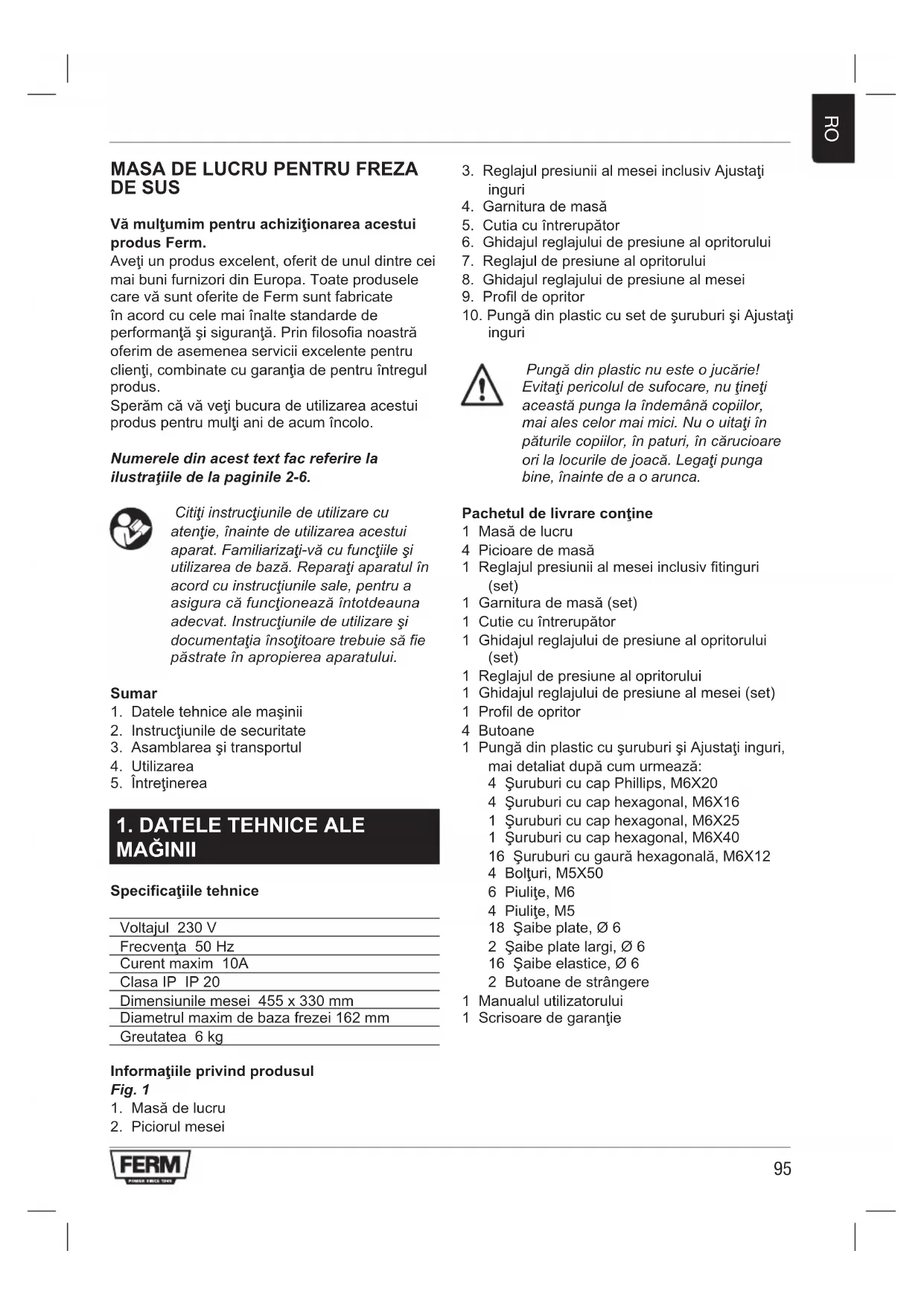 DE SUS Vă mulţumim pentru achiziţionarea acestui produs Ferm. Aveţi un produs excelent, oferit de unul dintre cei mai buni furnizori din Europa. Toate produsele care vă sunt oferite de Ferm sunt fabricate în acord cu cele mai înalte standarde de performanţă şi siguranţă. Prin filosofia noastră oferim de asemenea servicii excelente pentru clienţi, combinate cu garanţia de pentru întregul produs. Sperăm că vă veţi bucura de utilizarea acestui produs pentru mulţi ani de acum încolo. Numerele din acest text fac referire la ilustraţiile de la paginile 2-6. Citiţiinstrucţiuniledeutilizarecu atenţie,înaintedeutilizareaacestui aparat.Familiarizaţi-văcufuncţiileşi utilizareadebază.Reparaţiaparatulîn acordcuinstrucţiunilesale,pentrua asiguracăfuncţioneazăîntotdeauna adecvat.Instrucţiuniledeutilizareşi documentaţiaînsoţitoaretrebuiesăfie păstrateînapropiereaaparatului. Sumar