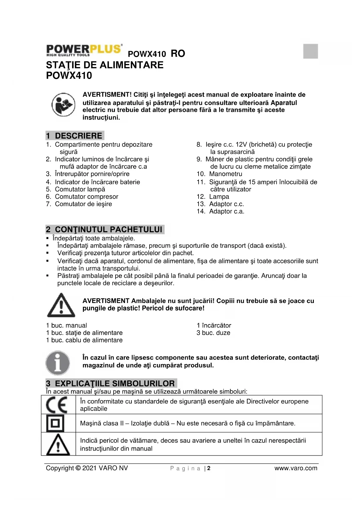 EN61000-6-3 : 2007 Persoana care păstrează documentaţia tehnică : Philippe Vankerkhove, VARO – Vic. Van Rompuy N.V. Subsemnatul acţionează în numele Directorului general executiv al societăţii, Ludo Mertens Divizia de reglementare – Director de conformitate 12/07/2021, Lier - BelgiumPOWX410 PL Copyright © 2021 VARO S t r o n a | 1 www.varo.com 1 OPIS ................................................................................................. 2