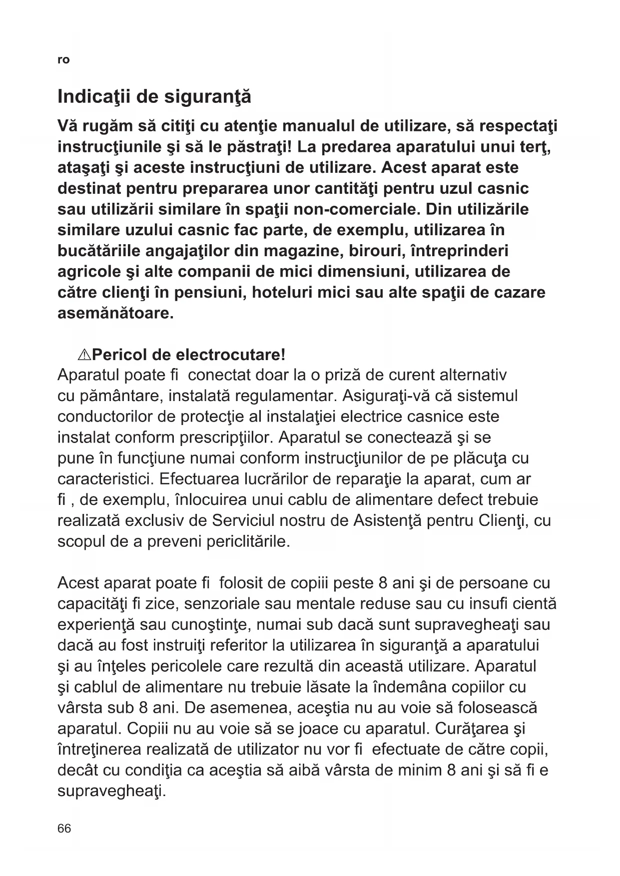 Indicaţiidesiguranţă Vărugămsăcitiţicuatenţiemanualuldeutilizare,sărespectaţi instrucţiunileşisălepăstraţi!Lapredareaaparatuluiunuiterţ, ataşaţişiacesteinstrucţiunideutilizare.Acestaparateste destinatpentrupreparareaunorcantităţipentruuzulcasnic sauutilizăriisimilareînspaţiinon-comerciale.Dinutilizările similareuzuluicasnicfacparte,deexemplu,utilizareaîn bucătăriileangajaţilordinmagazine,birouri,întreprinderi agricoleşialtecompaniidemicidimensiuni,utilizareade cătreclienţiînpensiuni,hotelurimicisaualtespaţiidecazare asemănătoare. ¡ Pericol de electrocutare! Aparatul poate conectat doar la o priză de curent alternativ cu pământare, instalată regulamentar. Asiguraţivă că sistemul conductorilor de protecţie al instalaţiei electrice casnice este instalat conform prescripţiilor. Aparatul se conectează şi se pune în funcţiune numai conform instrucţiunilor de pe plăcuţa cu caracteristici. Efectuarea lucrărilor de reparaţie la aparat, cum ar , de exemplu, înlocuirea unui cablu de alimentare defect trebuie realizată exclusiv de Serviciul nostru de Asistenţă pentru Clienţi, cu scopul de a preveni periclitările. Acest aparat poate folosit de copiii peste 8 ani şi de persoane cu capacităţi zice, senzoriale sau mentale reduse sau cu insu cientă experienţă sau cunoştinţe, numai sub dacă sunt supravegheaţi sau dacă au fost instruiţi referitor la utilizarea în siguranţă a aparatului şi au înţeles pericolele care rezultă din această utilizare. Aparatul şi cablul de alimentare nu trebuie lăsate la îndemâna copiilor cu vârsta sub 8 ani. De asemenea, aceştia nu au voie să folosească aparatul. Copiii nu au voie să se joace cu aparatul. Curăţarea şi întreţinerea realizată de utilizator nu vor efectuate de către copii, decât cu condiţia ca aceştia să aibă vârsta de minim 8 ani şi să e supravegheaţi.67