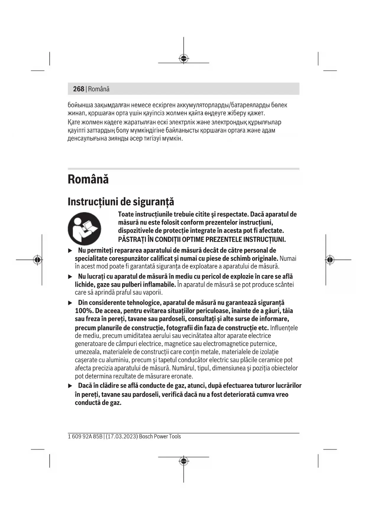 www.bosch-pt.com/serviceaddresses Кәдеге жарату Өлшеу құралын, оның жабдықтары мен қаптамасын қоршаған ортаны қорғайтын кәдеге жарату орнына тапсыру қажет. Қлшеу құралдарын не батареяларды үй қоқысына тастамаңыз! Тек қана ЕО елдері үшін: Ескі электрлік және электрондық құрылғылар туралы 2012/19/EU еуропалық директивасы және оның ұлттық заңнамада қолданылуы бойынша пайдалануға бұдан былай жарамсыз өлшеу құралдарын және 2006/66/ЕC еуропалық директивасы Bosch Power Tools 1 609 92A 85B | (17.03.2023)268 | Română бойынша зақымдалған немесе ескірген аккумуляторларды/батареяларды бөлек жинап, қоршаған орта үшін қауіпсіз жолмен қайта өңдеуге жіберу қажет. Қате жолмен кәдеге жаратылған ескі электрлік және электрондық құрылғылар қауіпті заттардың болу мүмкіндігіне байланысты қоршаған ортаға және адам денсаулығына зиянды әсер тигізуі мүмкін. Română Instrucţiuni de siguranţă Toate instrucţiunile trebuie citite şi respectate. Dacă aparatul de măsură nu este folosit conform prezentelor instrucţiuni, dispozitivele de protecţie integrate în acesta pot fi afectate. PĂSTRAŢI ÎN CONDIŢII OPTIME PREZENTELE INSTRUCŢIUNI. u Nu permiteţi repararea aparatului de măsură decât de către personal de specialitate corespunzător calificat şi numai cu piese de schimb originale. Numai în acest mod poate fi garantată siguranţa de exploatare a aparatului de măsură. u Nu lucraţi cu aparatul de măsură în mediu cu pericol de explozie în care se află lichide, gaze sau pulberi inflamabile. În aparatul de măsură se pot produce scântei care să aprindă praful sau vaporii. u Din considerente tehnologice, aparatul de măsură nu garantează siguranţă 100%. De aceea, pentru evitarea situaţiilor periculoase, înainte de a găuri, tăia sau freza în pereţi, tavane sau pardoseli, consultaţi şi alte surse de informare, precum planurile de construcţie, fotografii din faza de construcţie etc. Influenţele de mediu, precum umiditatea aerului sau vecinătatea altor aparate electrice generatoare de câmpuri electrice, magnetice sau electromagnetice puternice, umezeala, materialele de construcţii care conţin metale, materialele de izolaţie caşerate cu aluminiu, precum şi tapetul conducător electric sau plăcile ceramice pot afecta precizia aparatului de măsură. Numărul, tipul, dimensiunea şi poziţia obiectelor pot determina rezultate de măsurare eronate. u Dacă în clădire se află conducte de gaz, atunci, după efectuarea tuturor lucrărilor în pereţi, tavane sau pardoseli, verifică dacă nu a fost deteriorată cumva vreo conductă de gaz. 1 609 92A 85B | (17.03.2023) Bosch Power ToolsRomână | 269 u Înainte de fixarea obiectelor pe pereţi din Gips-carton, în special în cazul fixării pe substructuri, verifică dacă pereţii, respectiv materialele de fixare sunt suficient de rezistente pentru a le susţine. Descrierea produsului şi a performanțelor sale Ţineţi cont de ilustraţiile din secţiunea anterioară a instrucţiunilor de utilizare. Utilizarea conform destinaţiei Aparatul de măsură este destinat detectării de metale (metale feroase şi neferoase, de exemplu, armături din fier) şi conductori aflaţi sub tensiune din pereţi, plafoane şi pardoseli, precum şi grinzi din lemn aflate în pereţi de gips-carton. Aparatul de măsură este destinat utilizării în mediul interior. Componentele ilustrate Numerotarea componentelor ilustrate se referă la schiţa aparatului de măsură de la pagina grafică. (1) Capac al compartimentului pentru baterii (2) Tastă de pornire/oprire/Tastă pentru măsurare (3) Afişaj (ecran tactil) (4) Inel luminiscent (5) Orificiu de marcare (6) Zonă de detecţie a senzorilor (7) Număr de serie (8) Senzor de perete (9) Suprafaţă de prindere Elementele de pe afişaj (a) Zonă de navigare (b) Zonă de informaţii (c) Bară de stare (d) Indicator număr pagină (numai pentru meniurile cu mai multe pagini) (e) Indicator semnal sonor (f) Indicator baterie Bosch Power Tools 1 609 92A 85B | (17.03.2023)270 | Română Date tehnice Detector digital UniversalDetect Număr de identificare 3603F813.. Adâncime maximă de detectare