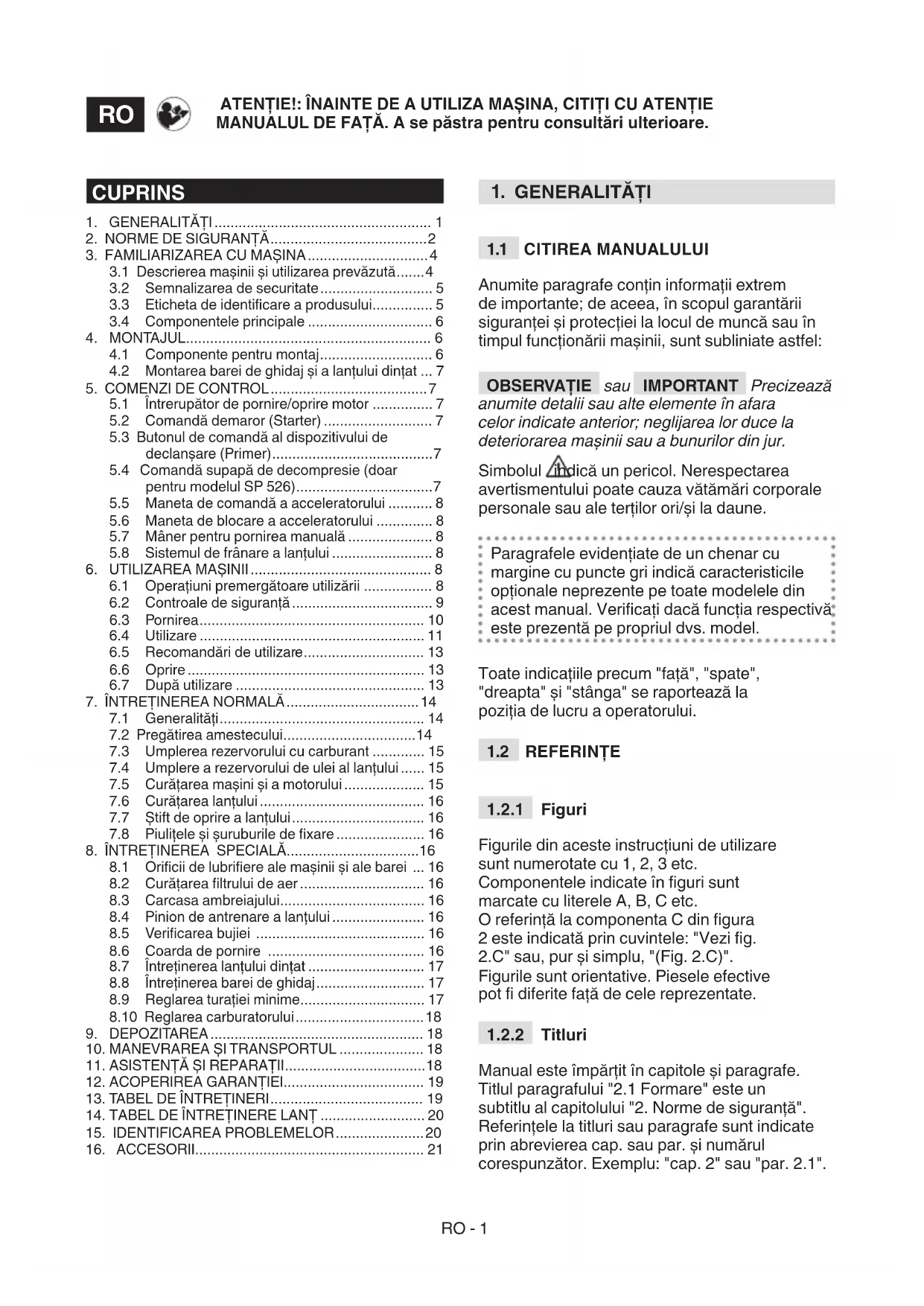 În "Tabelul pentru o asociere corectă bară- lanţ" sunt enumerate toate asocierile posibile dintre bară și lanţ, cele care se pot aplica pe ecare model de mașină în parte ind marcate cu simbolul "". În același tabel mai sunt redate și datele caracteristice ale lanţurilor și barelor omologate pentru ecare model de mașină. Pentru piese de schimb, utilizați doar barele și lanțurile citate în tabel. Utilizarea combinațiilor neaprobate poate cauza vătămări corporale grave și deteriorarea mașinii. Având în vedere faptul că alegerea, aplicarea și utilizarea barei și a lanțului sunt acțiuni efectuate voluntar de către utilizator, acesta își asumă implicit și răspunderea pentru daunele de orice natură care decurg din aceste acțiuni. În caz de neclarități sau de necunoaștere a specicității ecărei bare sau lanț în parte, trebuie să vă contactați revânzătorul sau un centru de grădinărit specializat.RU - 1