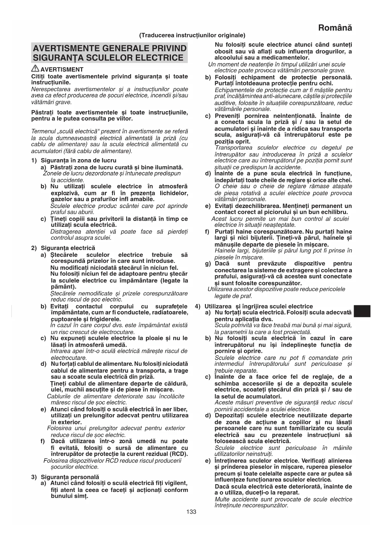 a) Atunci când folosiţi o sculă electrică fi ţi vigilent, fi ţi atent la ceea ce faceţi și acţionaţi conform bunului simţ. (Traducerea instrucţiunilor originale) 0000BookCH36DL.indb1330000BookCH36DL.indb133 2014/09/0316:59:462014/09/0316:59:46134 Română f) Păstraţi elementele de tăiere curate și ascuţite. Elementele de tăiere bine întreţinute și cu muchiile de tăiere bine ascuţite sunt mai ușor de controlat și este mai puţin probabil să se agaţe. g) Folosiţi scula electrică, accesoriile și vârfurile etc. în conformitate cu prezentele instrucţiuni, luând în considerare condiţiile de lucru și operaţiunile ce urmează a fi efectuate. Folosirea sculei electrice pentru alte operaţiuni decât cele prevăzute poate avea ca efect apariţia unor situaţii periculoase.