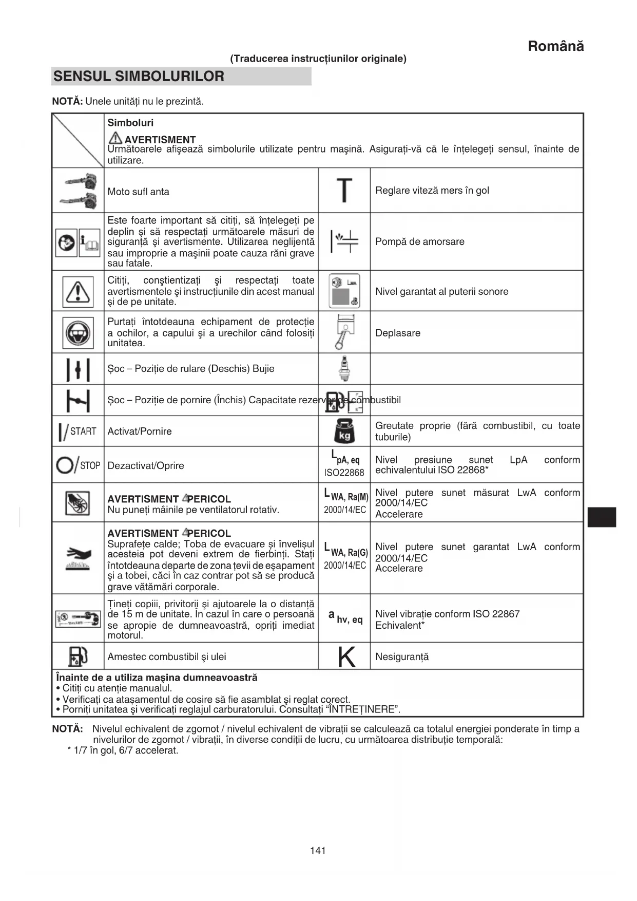 (Traducerea instrucţiunilor originale) SENSUL SIMBOLURILOR NOTĂ: Unele unităţi nu le prezintă. Simboluri AVERTISMENT Următoarele afi şează simbolurile utilizate pentru maşină. Asiguraţi-vă că le înţelegeţi sensul, înainte de utilizare. Moto sufl anta Reglare viteză mers în gol Este foarte important să citiţi, să înţelegeţi pe deplin şi să respectaţi următoarele măsuri de siguranţă şi avertismente. Utilizarea neglijentă sau improprie a maşinii poate cauza răni grave sau fatale. Pompă de amorsare Citiţi, conştientizaţi şi respectaţi toate avertismentele şi instrucţiunile din acest manual şi de pe unitate. Nivel garantat al puterii sonore Purtaţi întotdeauna echipament de protecţie a ochilor, a capului şi a urechilor când folosiţi unitatea. Deplasare Șoc – Poziţie de rulare (Deschis) Bujie Șoc – Poziţie de pornire (Închis) Capacitate rezervor de combustibil START Activat/Pornire Greutate proprie (fără combustibil, cu toate tuburile) STOP Dezactivat/Oprire