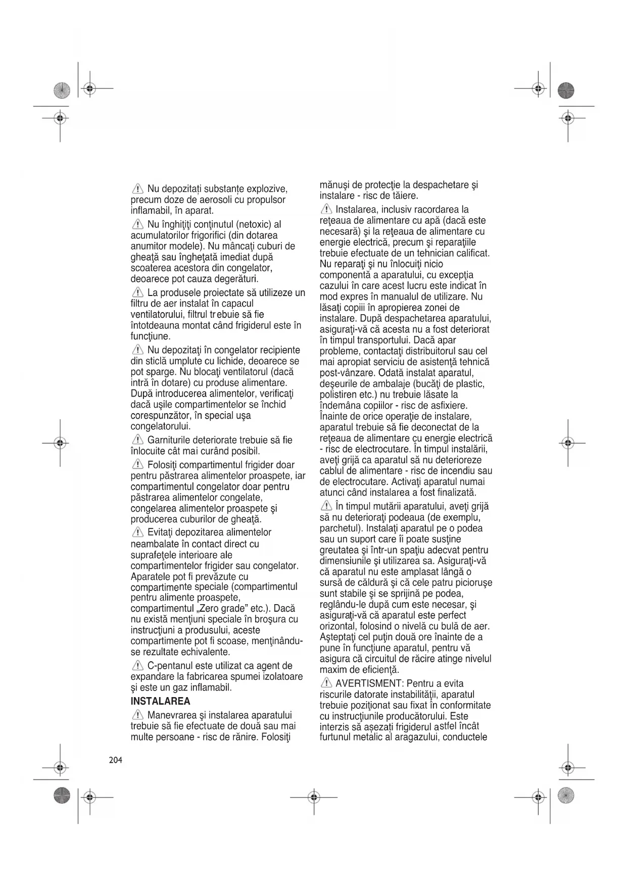 - Toate aparatele prevăzute cu dispozitive de producere a gheţii și cu distribuitoare de apă trebuie să fie conectate la o reţea de alimentare cu apă ce furnizează în exclusivitate apă potabilă (cu o presiune a reţelei hidraulice cuprinsă între 0,17 și 0,81 MPa (1,7 și 8,1 bar)). Distribuitoarele de gheaţă și/sau apă care nu sunt conectate direct la reţeaua de alimentare cu apă trebuie să fie umplute doar cu apă potabilă.