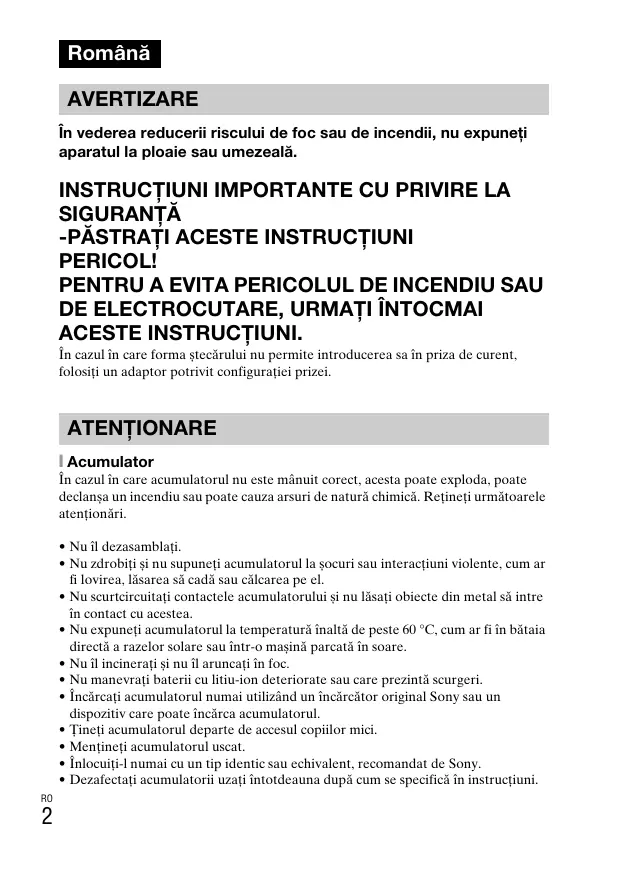 - Folosiţi acumulatori sau încărcătoare Sony originali(e).