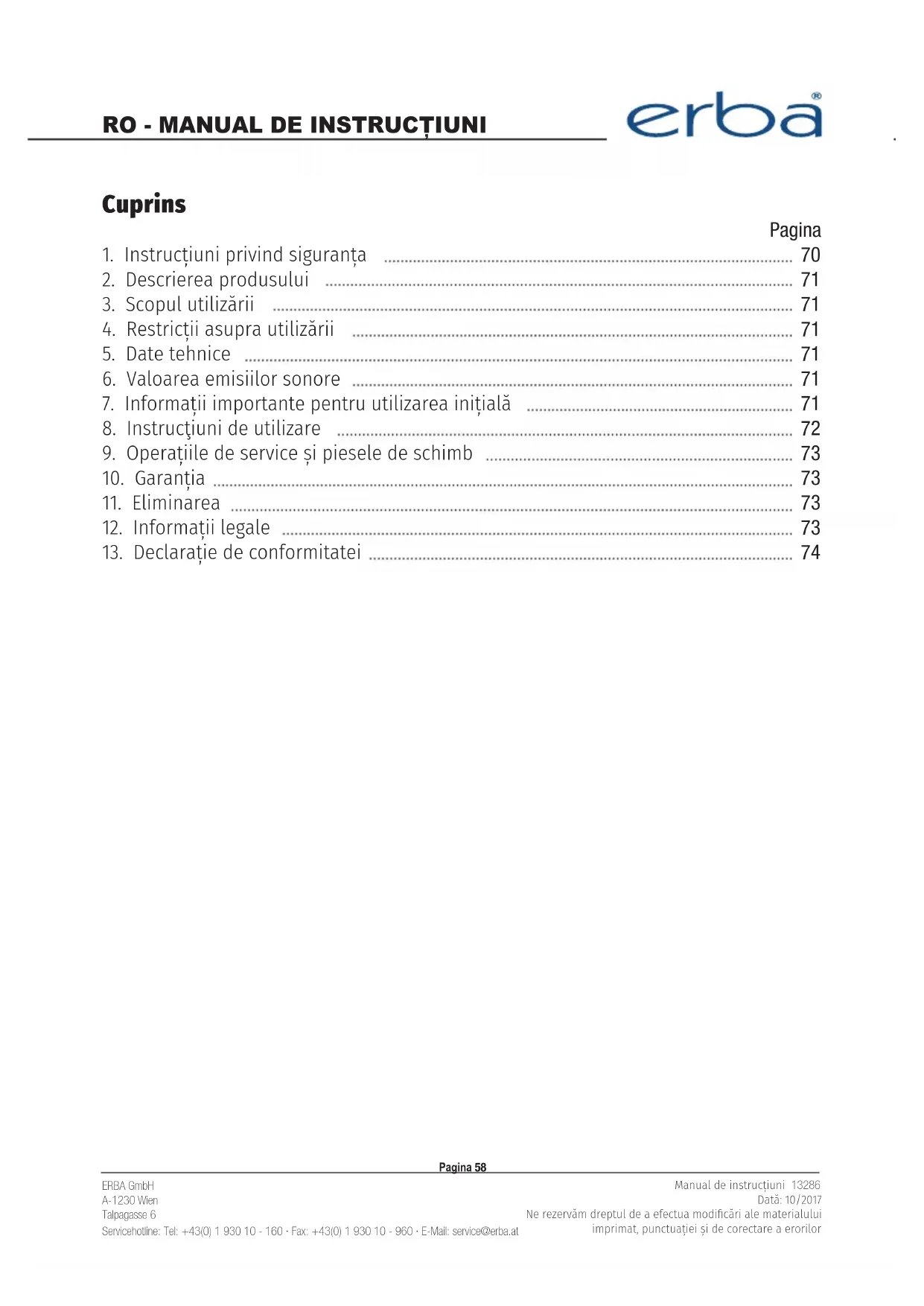 A-1230 Wien Talpagasse 6 Servicehotline: Tel: +43(0) 1 930 10 - 160 · Fax: +43(0) 1 930 10 - 960 · E-Mail: service@erba.at Manual de instrucțiuni 13286 Dată: 10/2017 Ne rezervăm dreptul de a efectua modificări ale materialului imprimat, punctuației și de corectare a erorilor Pagina 61
