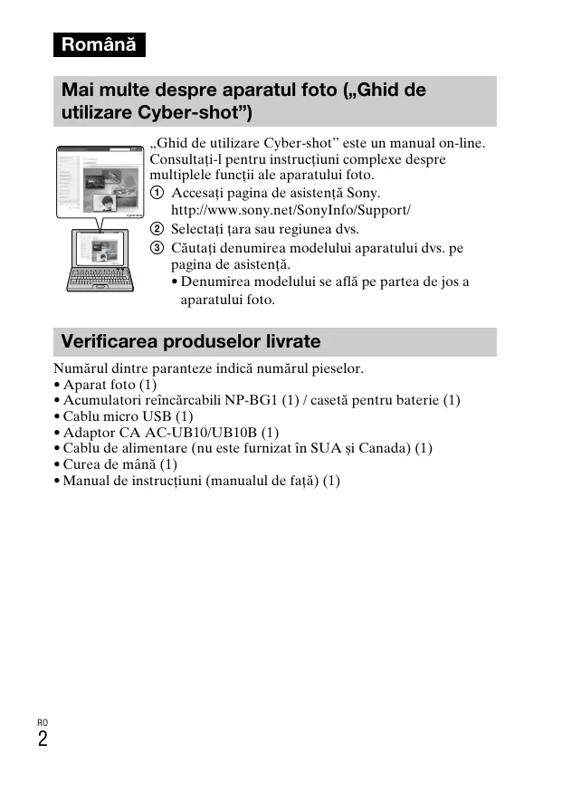Română Mai multe despre aparatul foto („Ghid de utilizare Cyber-shot”) „Ghid de utilizare Cyber-shot” este un manual on-line. Consultaţi-l pentru instrucţiuni complexe despre multiplele funcţii ale aparatului foto. 1 Accesaţi pagina de asistenţă Sony. http://www.sony.net/SonyInfo/Support/ 2 Selectaţi ţara sau regiunea dvs. 3 Căutaţi denumirea modelului aparatului dvs. pe pagina de asistenţă.