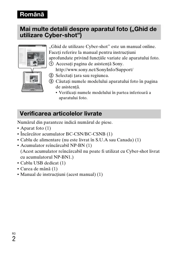 Română Mai multe detalii despre aparatul foto („Ghid de utilizare Cyber-shot”) „Ghid de utilizare Cyber-shot” este un manual online. Faceţi referire la manual pentru instrucţiuni aprofundate privind funcţiile variate ale aparatului foto. 1 Accesaţi pagina de asistenţă Sony. http://www.sony.net/SonyInfo/Support/ 2 Selectaţi ţara sau regiunea. 3 Căutaţi numele modelului aparatului foto în pagina de asistenţă.