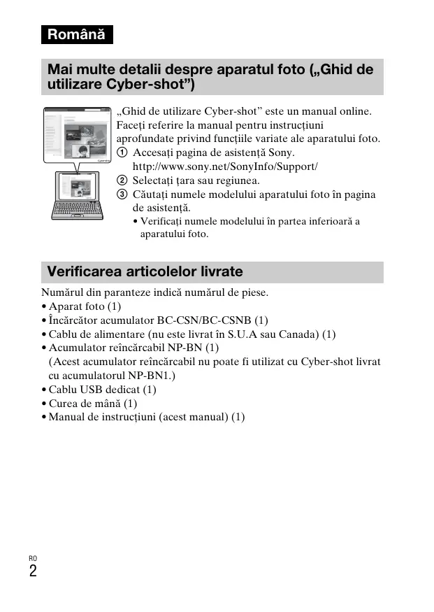 Română Mai multe detalii despre aparatul foto („Ghid de utilizare Cyber-shot”) „Ghid de utilizare Cyber-shot” este un manual online. Faceţi referire la manual pentru instrucţiuni aprofundate privind funcţiile variate ale aparatului foto. 1 Accesaţi pagina de asistenţă Sony. http://www.sony.net/SonyInfo/Support/ 2 Selectaţi ţara sau regiunea. 3 Căutaţi numele modelului aparatului foto în pagina de asistenţă.