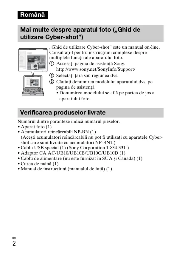 Română Mai multe despre aparatul foto („Ghid de utilizare Cyber-shot”) „Ghid de utilizare Cyber-shot” este un manual on-line. Consultaţi-l pentru instrucţiuni complexe despre multiplele funcţii ale aparatului foto. 1 Accesaţi pagina de asistenţă Sony. http://www.sony.net/SonyInfo/Support/ 2 Selectaţi ţara sau regiunea dvs. 3 Căutaţi denumirea modelului aparatului dvs. pe pagina de asistenţă.
