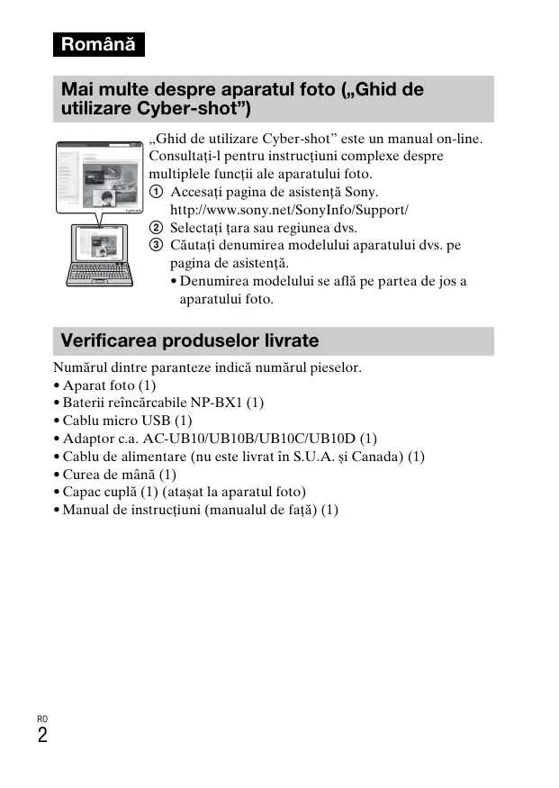 Română Mai multe despre aparatul foto („Ghid de utilizare Cyber-shot”) „Ghid de utilizare Cyber-shot” este un manual on-line. Consultaţi-l pentru instrucţiuni complexe despre multiplele funcţii ale aparatului foto. 1 Accesaţi pagina de asistenţă Sony. http://www.sony.net/SonyInfo/Support/ 2 Selectaţi ţara sau regiunea dvs. 3 Căutaţi denumirea modelului aparatului dvs. pe pagina de asistenţă.