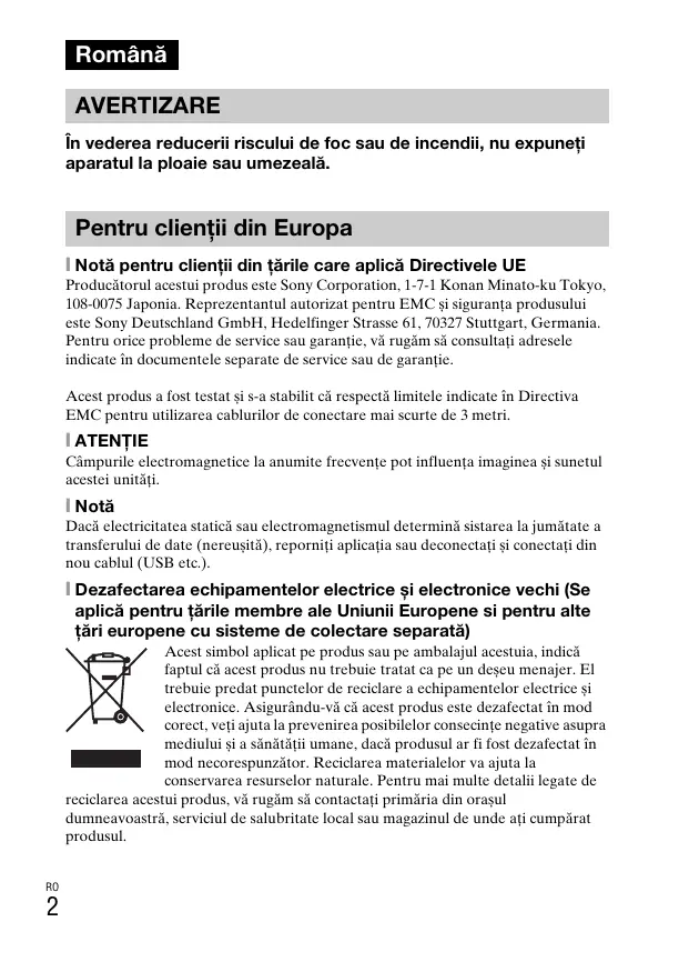Română AVERTIZARE În vederea reducerii riscului de foc sau de incendii, nu expuneţi aparatul la ploaie sau umezeală. Pentru clienţii din Europa [ Notă pentru clienţii din ţările care aplică Directivele UE Producătorul acestui produs este Sony Corporation, 1-7-1 Konan Minato-ku Tokyo, 108-0075 Japonia. Reprezentantul autorizat pentru EMC și siguranţa produsului este Sony Deutschland GmbH, Hedelfinger Strasse 61, 70327 Stuttgart, Germania. Pentru orice probleme de service sau garanţie, vă rugăm să consultaţi adresele indicate în documentele separate de service sau de garanţie. Acest produs a fost testat și s-a stabilit că respectă limitele indicate în Directiva EMC pentru utilizarea cablurilor de conectare mai scurte de 3 metri. [ ATENŢIE Câmpurile electromagnetice la anumite frecvenţe pot influenţa imaginea și sunetul acestei unităţi. [ Notă Dacă electricitatea statică sau electromagnetismul determină sistarea la jumătate a transferului de date (nereușită), reporniţi aplicaţia sau deconectaţi și conectaţi din nou cablul (USB etc.). [ Dezafectarea echipamentelor electrice și electronice vechi (Se aplică pentru ţările membre ale Uniunii Europene si pentru alte ţări europene cu sisteme de colectare separată) Acest simbol aplicat pe produs sau pe ambalajul acestuia, indică faptul că acest produs nu trebuie tratat ca pe un deșeu menajer. El trebuie predat punctelor de reciclare a echipamentelor electrice și electronice. Asigurându-vă că acest produs este dezafectat în mod corect, veţi ajuta la prevenirea posibilelor consecinţe negative asupra mediului și a sănătăţii umane, dacă produsul ar fi fost dezafectat în mod necorespunzător. Reciclarea materialelor va ajuta la conservarea resurselor naturale. Pentru mai multe detalii legate de reciclarea acestui produs, vă rugăm să contactaţi primăria din orașul dumneavoastră, serviciul de salubritate local sau magazinul de unde aţi cumpărat produsul.