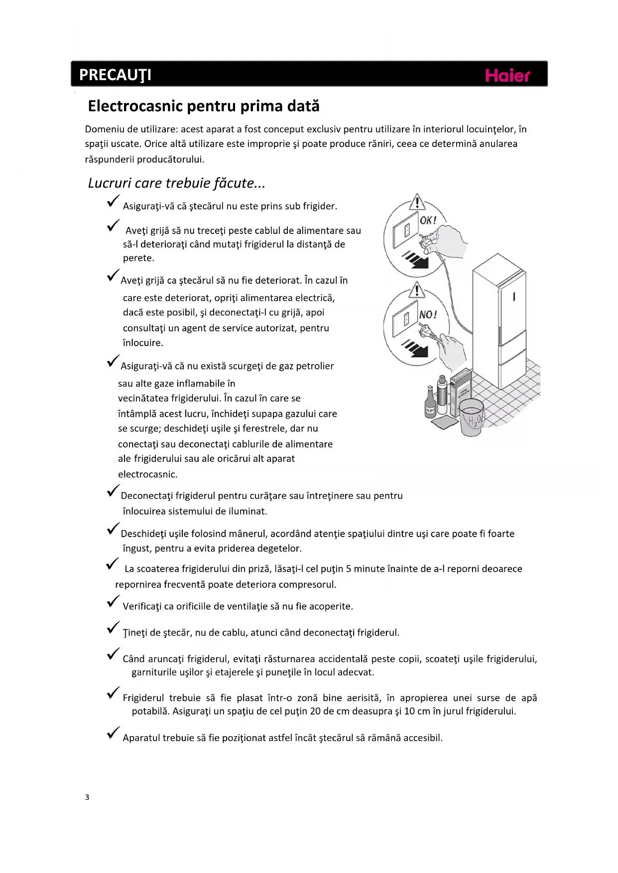 Electrocasnicpentruprimadată Domeniudeutilizare:acestaparatafostconceputexclusivpentruutilizareîn interiorullocuinţelor,în spaţiiuscate.Oricealtăutilizareesteimproprieşipoateproducerăniri,ceeacedeterminăanularea răspunderiiproducătorului. Lucruricaretrebuiefăcute... 9 Asiguraţi‐văcăştecărulnuestepri nssubfrigider. 9 Aveţigrijăsănutreceţipestecabluldealimentar esau să‐ldeterioraţicândmutaţifrigiderulladistanţăde perete. 9Aveţigrijăcaştecărulsănufiedeteriorat.Încazulîn careestedeteriorat,opriţialimentareaelectrică, dacăesteposibil,şideconectaţi‐lcugrijă,apoi consultaţiunagentdeserviceautorizat,pentru înlocuire. 9Asiguraţi‐văcănuexistăscurgeţidegazpetrolier saualtegazeinflamabileîn vecinătateafrigiderului.Încazulîncarese întâmplăacestlucru,închideţisupapagazuluicare sescurge;deschideţiuşileşiferestrele,darnu conectaţisaudeconectaţicabluriledealimentare ale frigideruluisaualeoricăruialtaparat electrocasnic. 9Deconectaţifrigiderulpentrucurăţaresauîntreţineresaupentru înlocuireasistemuluideiluminat. 9Deschideţiuşilefolosindmânerul,acordândatenţiespaţiuluidintreuşicarepoatefifoarte îngust,pentruaevitapridereadegetelor. 9 Lascoatereafrigideruluidinpriză,lăsaţi‐lcelpuţin5minuteînaintedea‐lrepornideoarece repornireafrecventăpoatedeterioracompresorul. 9 Verificaţicaorificiiledeventilaţiesănufieacoperite. 9 Ţineţideştecăr,nudecablu,atuncicânddeconectaţifrigiderul. 9 Cândaruncaţifrigiderul,evitaţirăsturnareaaccidentalăpestecopii,scoateţiuşilefrigiderului, garniturileuşilorşietajereleşipuneţileînloculadecvat. 9 Frigiderul trebuie să fie plasat într‐o zonă bine aerisită, în apropierea unei surse de apă potabilă.Asiguraţiunspaţiudecelpuţin20decmdeasupraşi10cmînjurulfrigiderului. 9 Aparatultrebuiesăfiepoziţionatastfelîncâtştecărulsărămânăaccesibil.