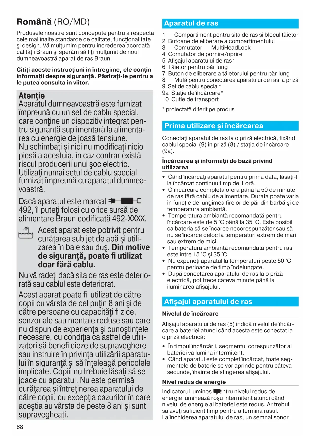 Tıraş makinesi batarya tam doluyken kapanıyor. Elek ve Bıçak kaseti ısındığı için motor daha fazla güç harcıyor. Makinenizi kapatın. – Elek ve Bıçak kasetini değiştirin. – Özellikle suyla temizlediğiniz zaman, tıraş sistemini düzenli olarak yağlayın.68 Română (RO/MD) Produsele noastre sunt concepute pentru a respecta cele mai înalte standarde de calitate, funcţionalitate şi design. Vă mulţumim pentru încrederea acordată calităţii Braun şi sperăm să fiţi mulţumit de noul dumneavoastră aparat de ras Braun. Citiţi aceste instrucţiuni în întregime, ele conţin informaţii despre siguranţă. Păstraţi-le pentru a le putea consulta în viitor. Atenţie Aparatul dumneavoastră este furnizat împreună cu un set de cablu special, care conţine un dispozitiv integrat pen- tru siguranţă suplimentară la alimenta- rea cu energie de joasă tensiune. Nu schimbaţi şi nici nu modificaţi nicio piesă a acestuia, în caz contrar există riscul producerii unui şoc electric. Utilizaţi numai setul de cablu special furnizat împreună cu aparatul dumnea- voastră. Dacă aparatul este marcat 492, îl puteţi folosi cu orice sursă de alimentare Braun codificată 492-XXXX. Acest aparat este potrivit pentru curăţarea sub jet de apă şi utili- zarea în baie sau duş. Din motive de siguranţă, poate fi utilizat doar fără cablu. Nu vă radeţi dacă sita de ras este deterio- rată sau cablul este deteriorat. Acest aparat poate fi utilizat de către copii cu vârsta de cel puţin 8 ani şi de către persoane cu capacităţi fi zice, senzoriale sau mentale reduse sau care nu dispun de experienţa şi cunoştinţele necesare, cu condiţia ca astfel de utili- zatori să benefi cieze de supraveghere sau instruire în privinţa utilizării aparatu- lui în siguranţă şi să înţeleagă pericolele implicate. Copiii nu trebuie lăsaţi să se joace cu aparatul. Nu este permisă curăţarea şi întreţinerea aparatului de către copii, cu excepţia cazurilor în care aceştia au vârsta de peste 8 ani şi sunt supravegheaţi. Aparatul de ras