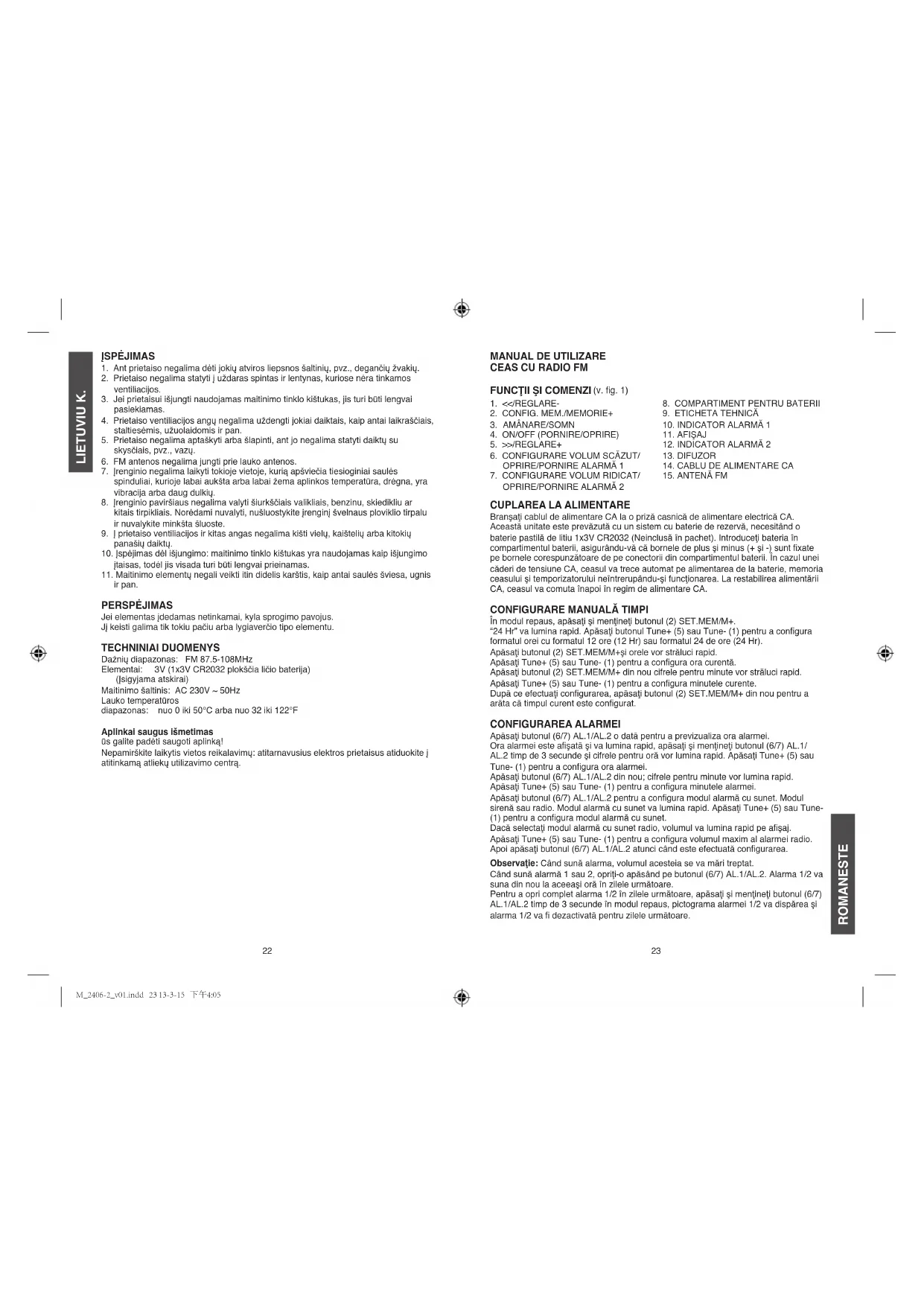 surse de căldură asemănătoare. MĂSURI dE PRECAUŢIE Există pericol de explozie dacă bateria este înlocuită în mod incorect. Înlocuiţi-o cu aceeaşi baterie sau un model echivalent. dATE TEHNiCE Gamă de frecvenţă: FM 87.5-108MHz Baterie de rezervă: 3V (1x3V CR2032 baterie tip pastilă litiu) (Nefurnizate) Sursa de alimentare: CA 230V ~ 50Hz Gama temperaturii pentru interior: de la 0 la 50°C sau de la 32 la 122°F Eliminare ecologică Puteţi ajuta la protejarea mediului! Respectaţi reglementările locale: predaţi echipamentele electronice scoase din uz la un centru specializat de eliminare a deşeurilor. M_2406-2_v01.indd 24-25 13-3-15 下午4:0526
