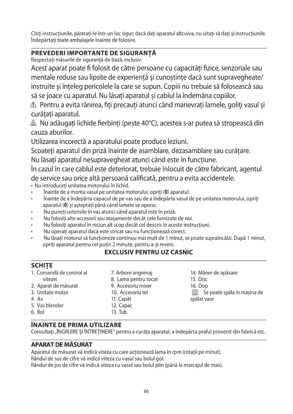Respectaţi măsurile de siguranţă de bază, inclusiv: Acest aparat poate folosit de către persoane cu capacități zice, senzoriale sau mentale reduse sau lipsite de experiență și cunoștințe dacă sunt supravegheate/ instruite și înțeleg pericolele la care se supun. Copiii nu trebuie să folosească sau să se joace cu aparatul. Nu lăsați aparatul și cablul la îndemâna copiilor. c Pentru a evita rănirea, ți precauți atunci când manevrați lamele, goliți vasul și curățați aparatul. h Nu adăugaţi lichide erbinţi (peste 40°C), acestea s-ar putea să stropească din cauza aburilor. Utilizarea incorectă a aparatului poate produce leziuni. Scoateţi aparatul din priză înainte de asamblare, dezasamblare sau curăţare. Nu lăsaţi aparatul nesupravegheat atunci când este în funcţiune. În cazul în care cablul este deteriorat, trebuie înlocuit de către fabricant, agentul de service sau orice altă persoană calicată, pentru a evita accidentele.