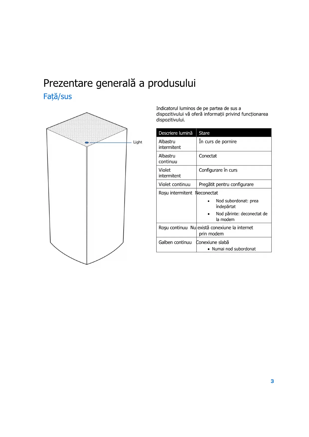 Linksys Velop ___________________________________________________________________________________________ 33 Cerințe de mediu _______________________________________________________________________________________ 333 Prezentare generală a produsului Față/sus Indicatorul luminos de pe partea de sus a dispozitivului vă oferă informații privind funcționarea dispozitivului. Descriere lumină Stare Albastru intermitent În curs de pornire Albastru continuu Conectat Violet intermitent Configurare în curs Violet continuu Pregătit pentru configurare Roșu intermitent Neconectat