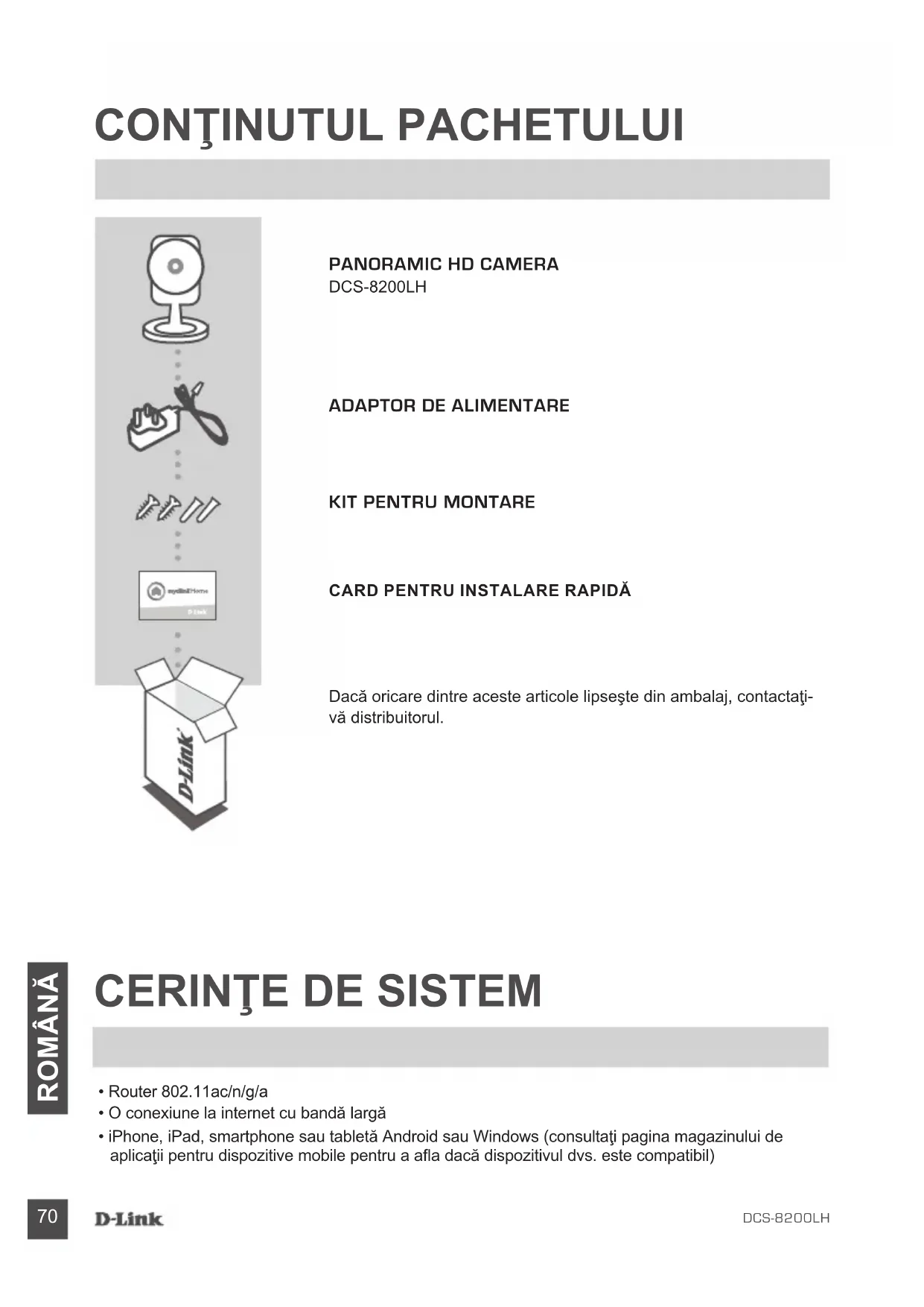 ROMÂNĂ Felicitări, camera dvs. DCS-8200LH este gata de utilizare! Vă recomandăm să consultaţi cu regularitate site-ul web dlink.com/mydlinkhomehelp pentru a descărca cele mai recente actualizări rmware. Astfel, vă puteţi asigura că produsul dvs. funcţionează în siguranţă şi că beneciaţi de cele mai noi caracteristici ale acestuia. Notă: Dacă întâmpinaţi probleme la înregistrarea camerei cu contul mydlink sau dacă aţi achiziţionat o unitate a cărei cutii a fost deschisă sau o unitate la mâna a doua, efectuaţi o resetare la valorile din fabrică apăsând şi menţinând apăsat butonul de resetare al dispozitivului timp de 10 secunde (dispozitivul trebuie să e pornit). Dacă returnaţi dispozitivul la locul de la care l-aţi achiziţionat, efectuaţi procedura de resetare la valorile din fabrică pentru a elimina toate datele personale din dispozitiv. Urmaţi instrucţiunile de mai jos pentru a congura Panoramic HD Camera. Pasul 1: Pe dispozitivul dvs. mobil, descărcaţi aplicaţia mydlink Home accesând mydlinkhomeapp. dlink.com sau căutând textul mydlink Home în iTunes App Store sau în Google Play. Pasul 2: Lansaţi aplicaţia mydlink Home şi creaţi un cont nou sau conectaţi-vă la un cont existent. iOS: Dacă vi se solicită să acordaţi aplicaţiei acces la locaţia dvs., selectaţi Allow (Permiteţi). Android: Asiguraţi-vă că serviciile de localizare sunt activate în setările telefonului. Pasul 3: După conectare, atingeţi pictograma Settings (Setări) din colţul din stânga-sus, selectaţi Add New Device (Adăugare dispozitiv nou) şi urmaţi instrucţiunile. Atunci când vi se solicită să scanaţi un cod QR, utilizaţi codul de pe cardul de instalare rapidă (aat în ambalajul produsului) sau de pe eticheta ataşată la dispozitivul dvs. CONFIGURAREA PRODUSULUI