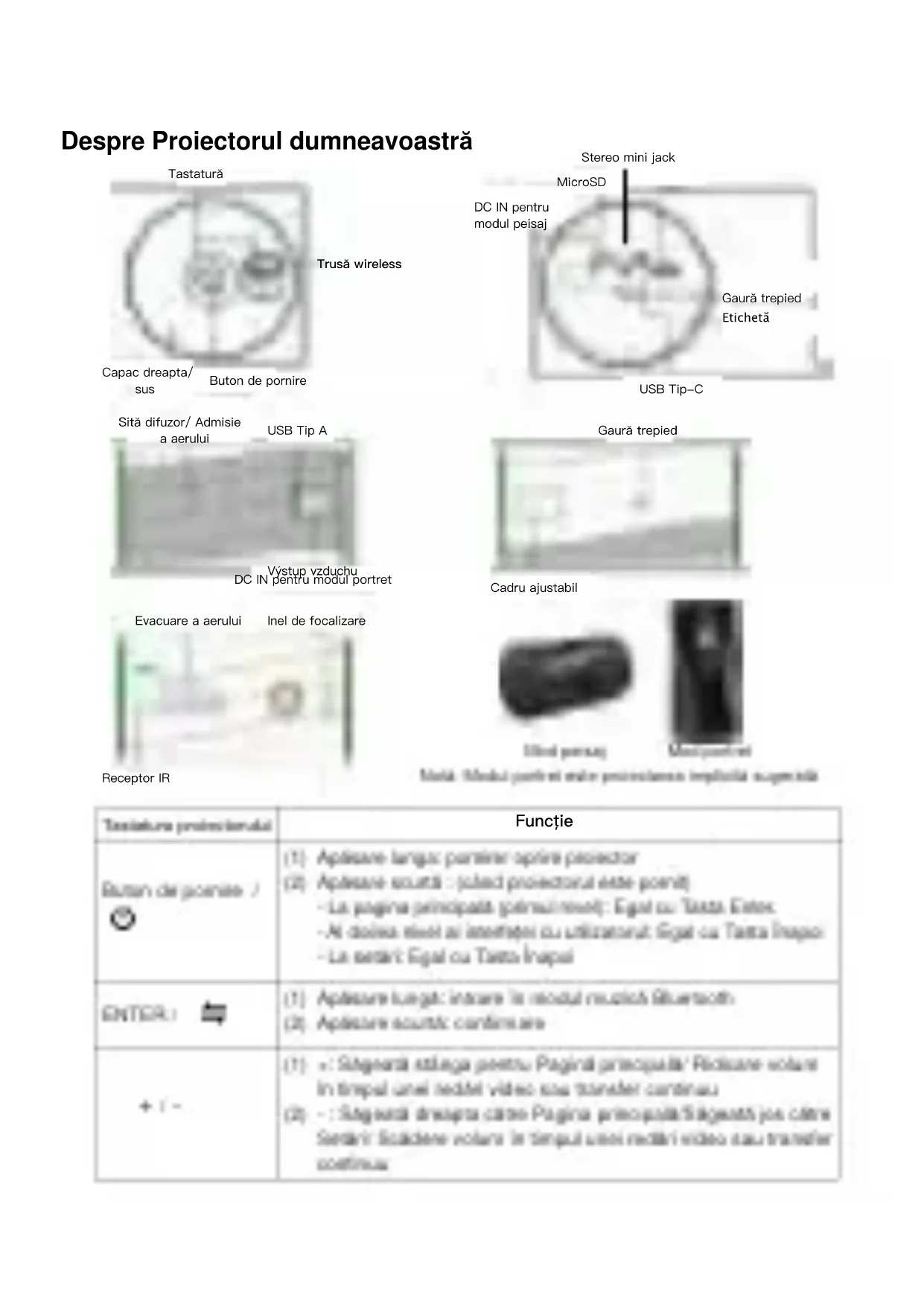 DDHUXOXL '&,1SHQWUXPRGXOSRUWUHW '&,1SHQWUX PRGXOSHLVDM *DXUÆWUHSLHG Etichetă 86%7LS& *DXUÆWUHSLHG &DGUXDMXVWDELO 0LFUR6' 6WHUHRPLQLMDFN 5HFHSWRU,5Despre telecomanda dumneavoastră Tasta de pornire pentru pornirea/oprirea proiectorului Tastă rapidă pentru a intra în modul muzica Bluetooth Tastă confirmare 4 taste de direcție Tastă înapoi Tastă rapidă pentru a intra în meniul principal Tastă meniu rapid Volum tare/încet Funcție